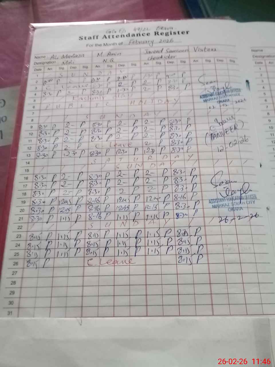 | CNIC | Full Name | Designation | R/C | Absence During Last Calender Month |