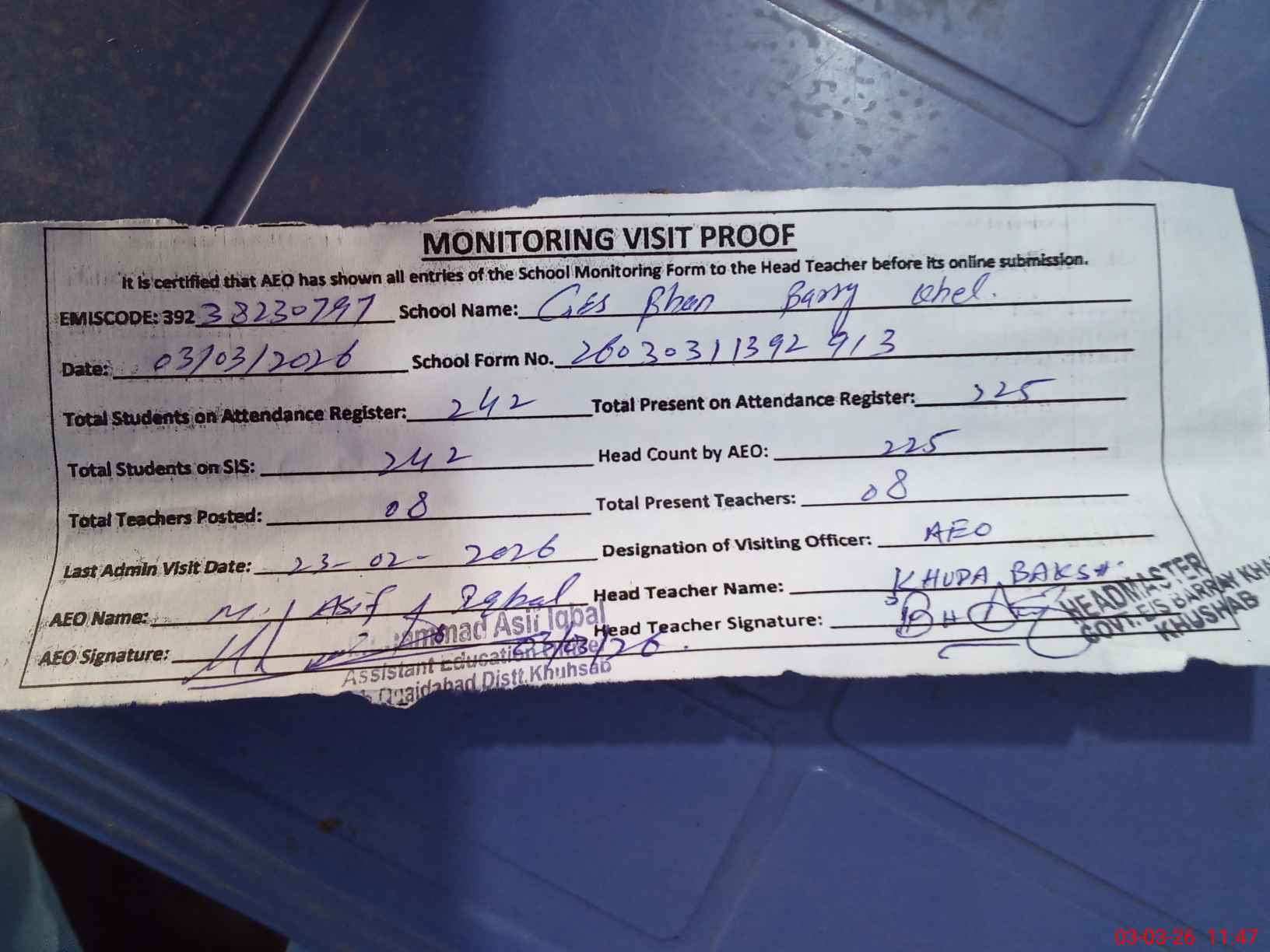 | Attendance Register | Head Teacher | MEA with School | Visit Proof |
