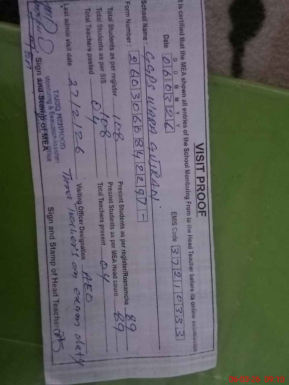 | Attendance Register | Head Teacher | MEA with School | Visit Proof |