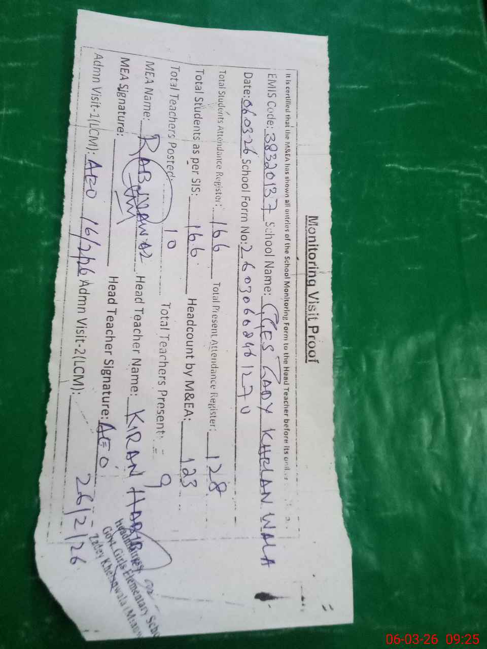 | Attendance Register | Head Teacher | MEA with School | Visit Proof |