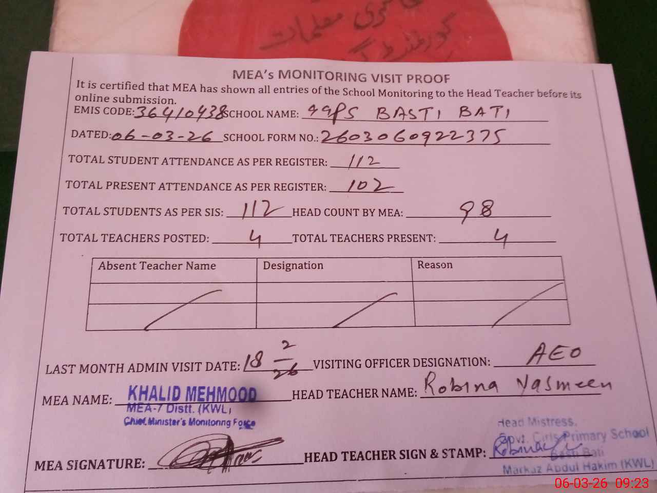 | Attendance Register | Head Teacher | MEA with School | Visit Proof |