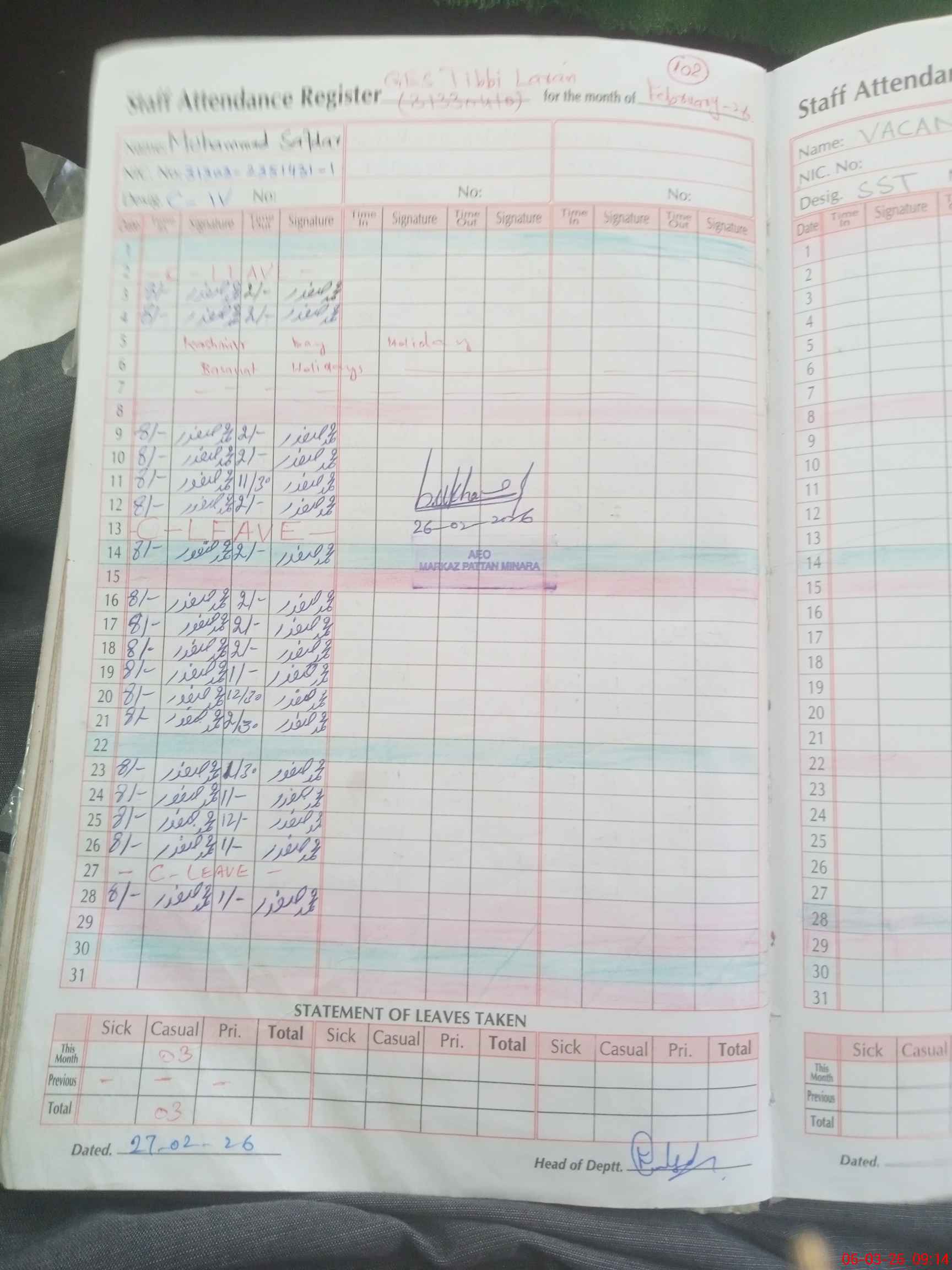 | CNIC | Full Name | Designation | R/C | Absence During Last Calender Month |