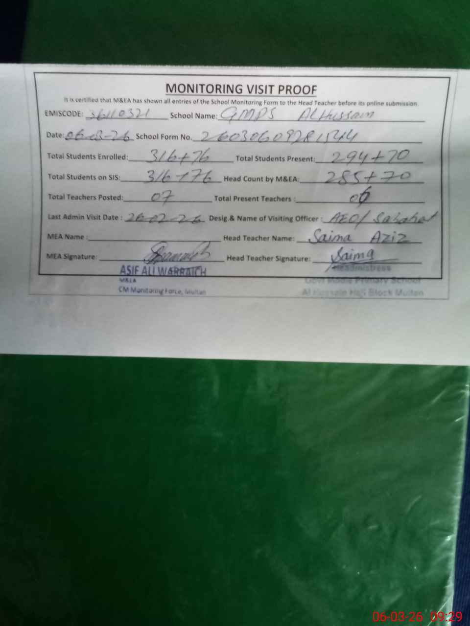 | Attendance Register | Head Teacher | MEA with School | Visit Proof |