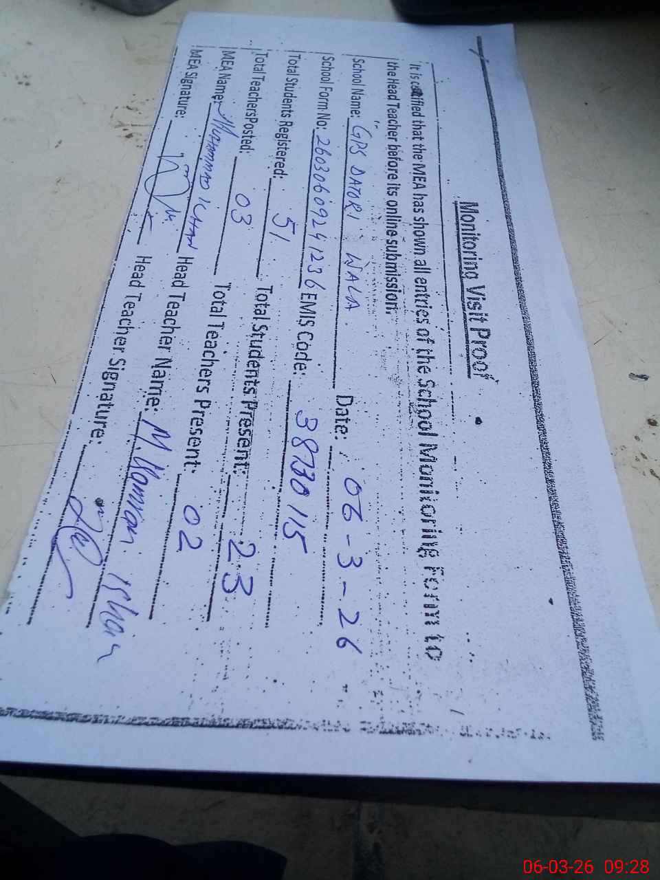 | EMIS Code: 38130115 | Name of School: GPS DATORI WALA | |||