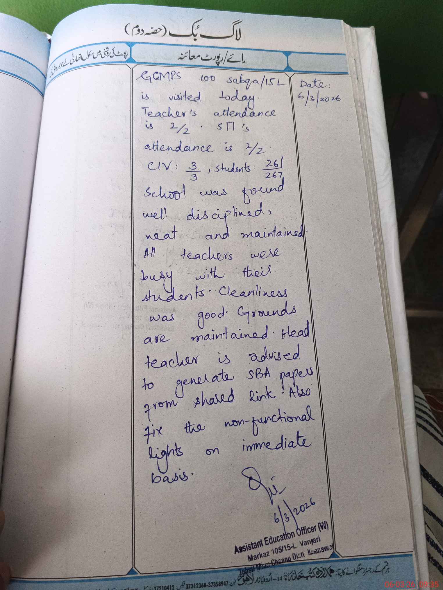 | Certified that this School was Inspected by the Undersigned MEA/DMO Today and the Information Stated Above is as Per Record. | |||||