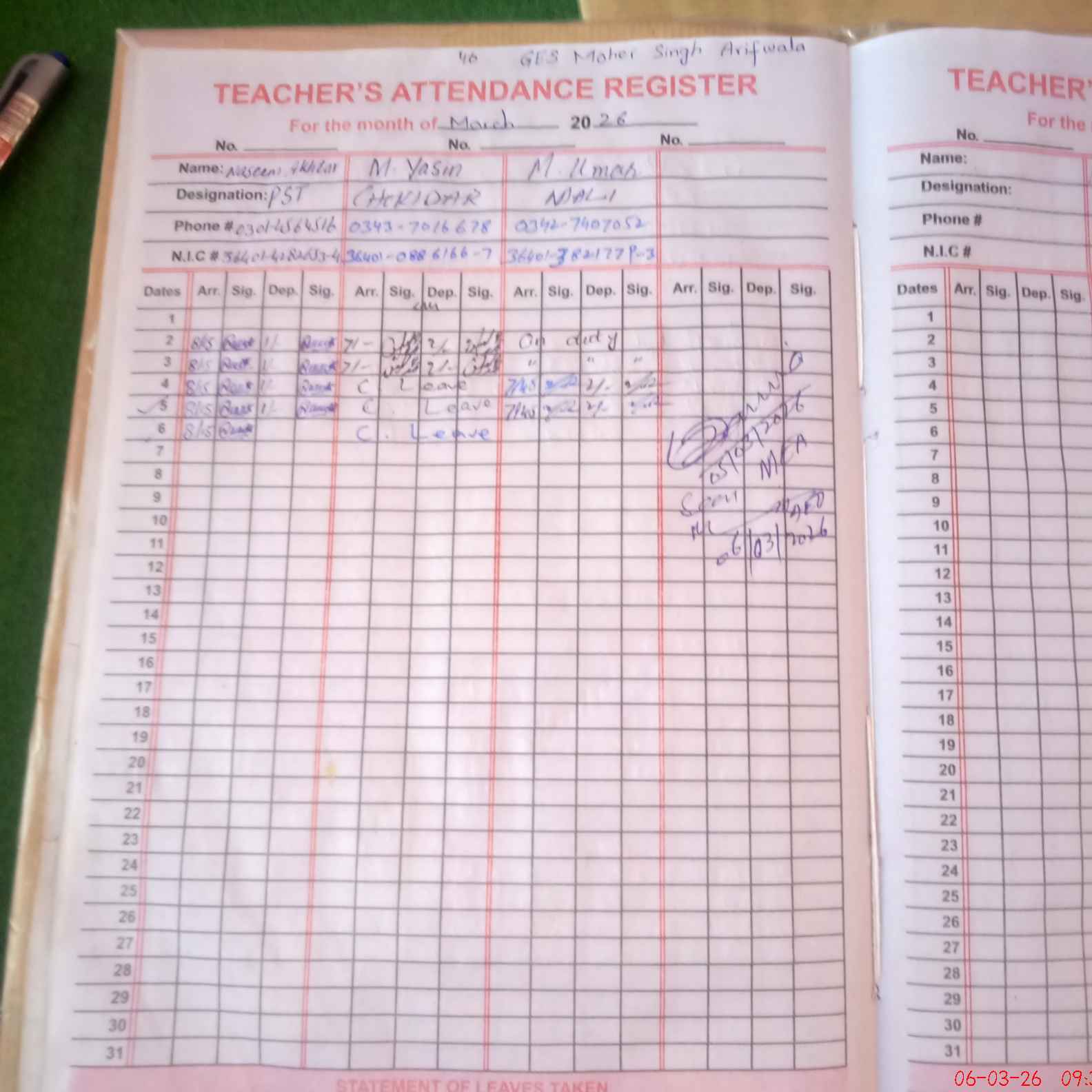 | CNIC | Full Name | Designation | R/C | Absence During Last Calender Month |