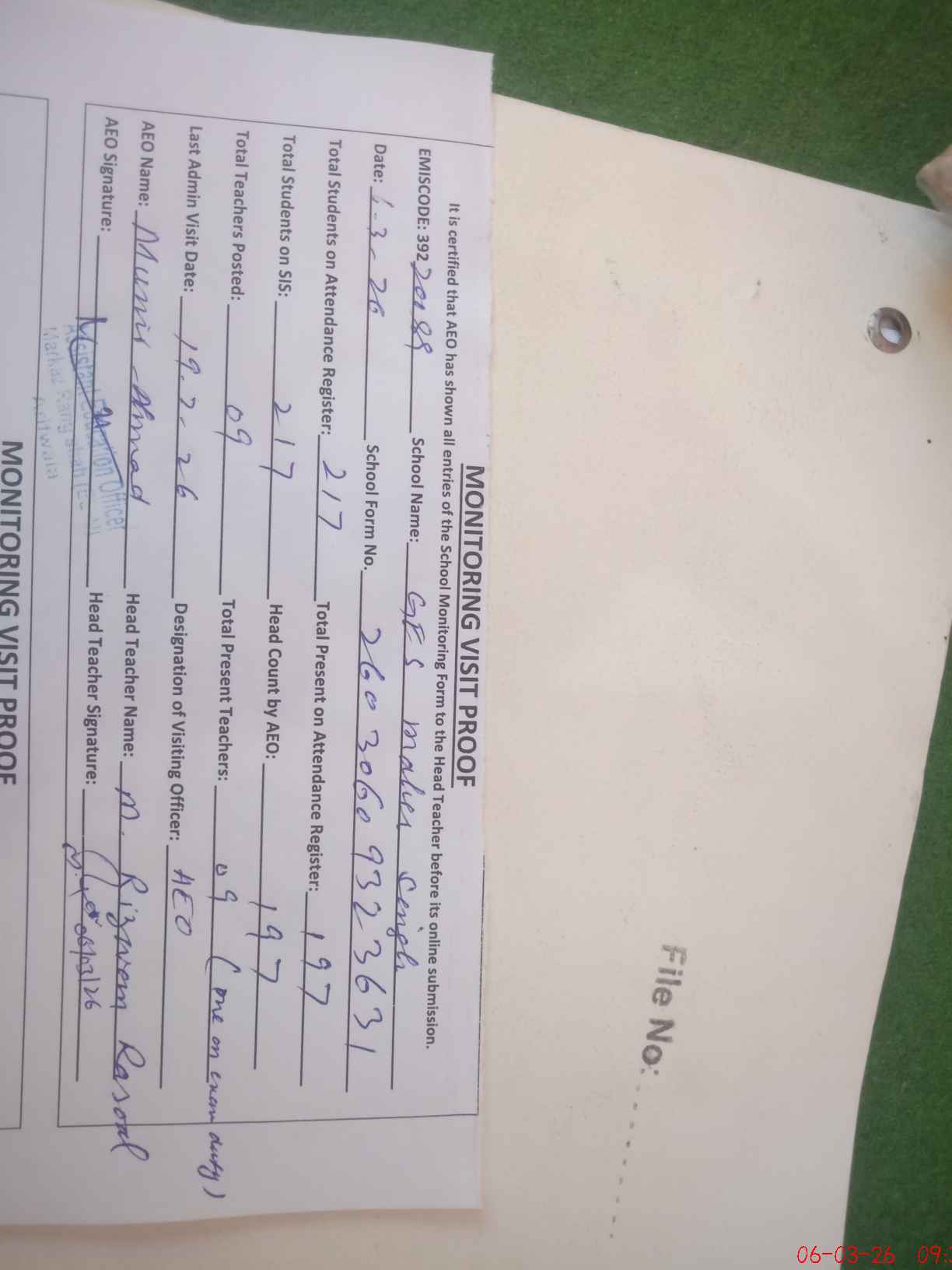 | Attendance Register | Head Teacher | MEA with School | Visit Proof |