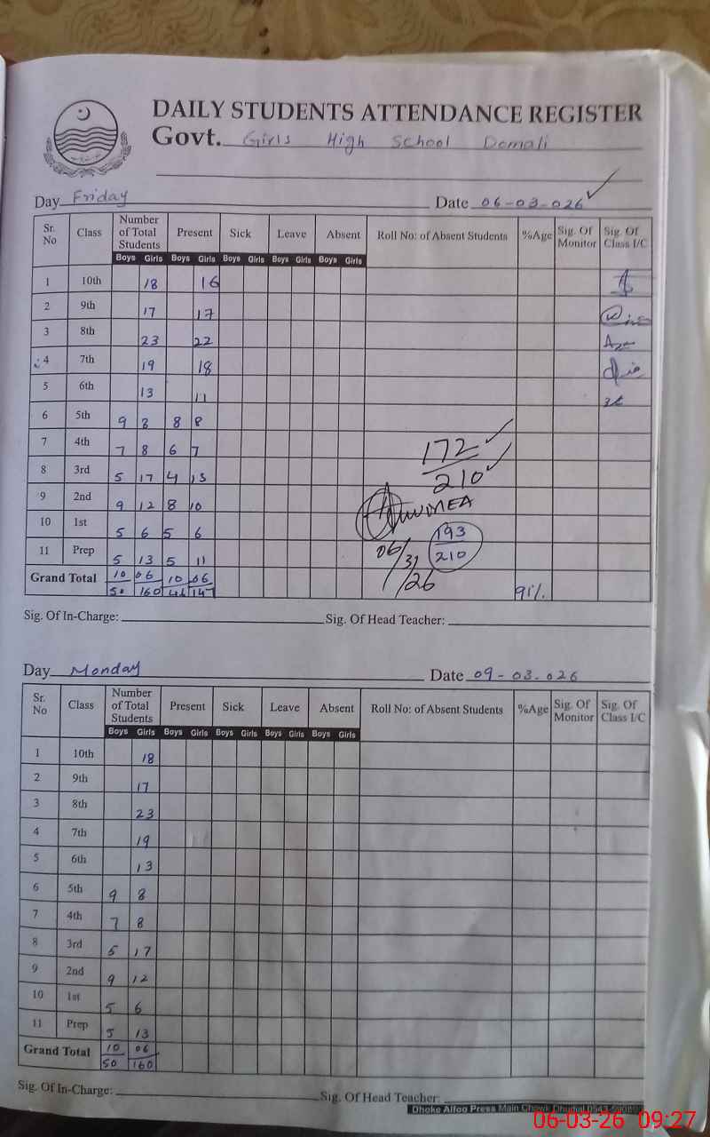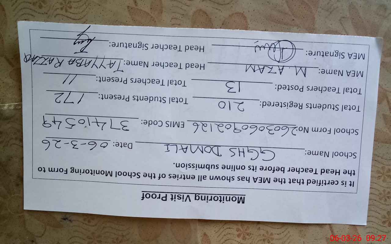 | Attendance Register | Head Teacher | MEA with School | Visit Proof |