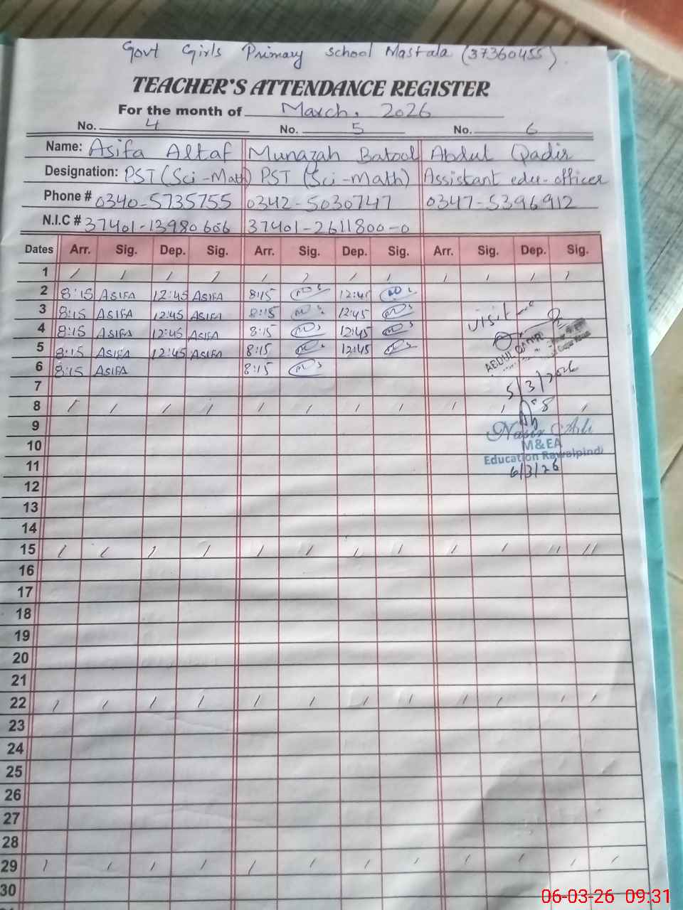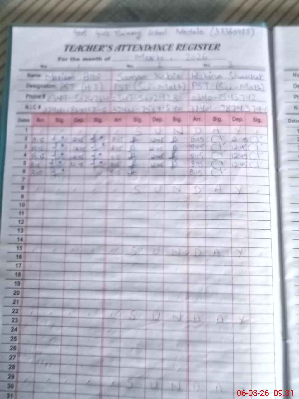 | Name: SU**** BA**** Designation: (School Headmaster's/Headmistress's) PST Phone/Cell Number: 03**** |