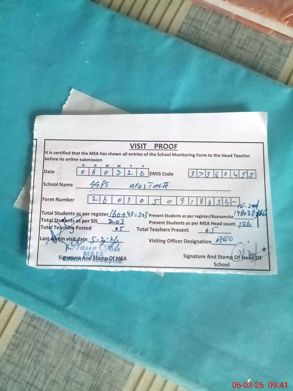 | Attendance Register | Head Teacher | MEA with School | Visit Proof |