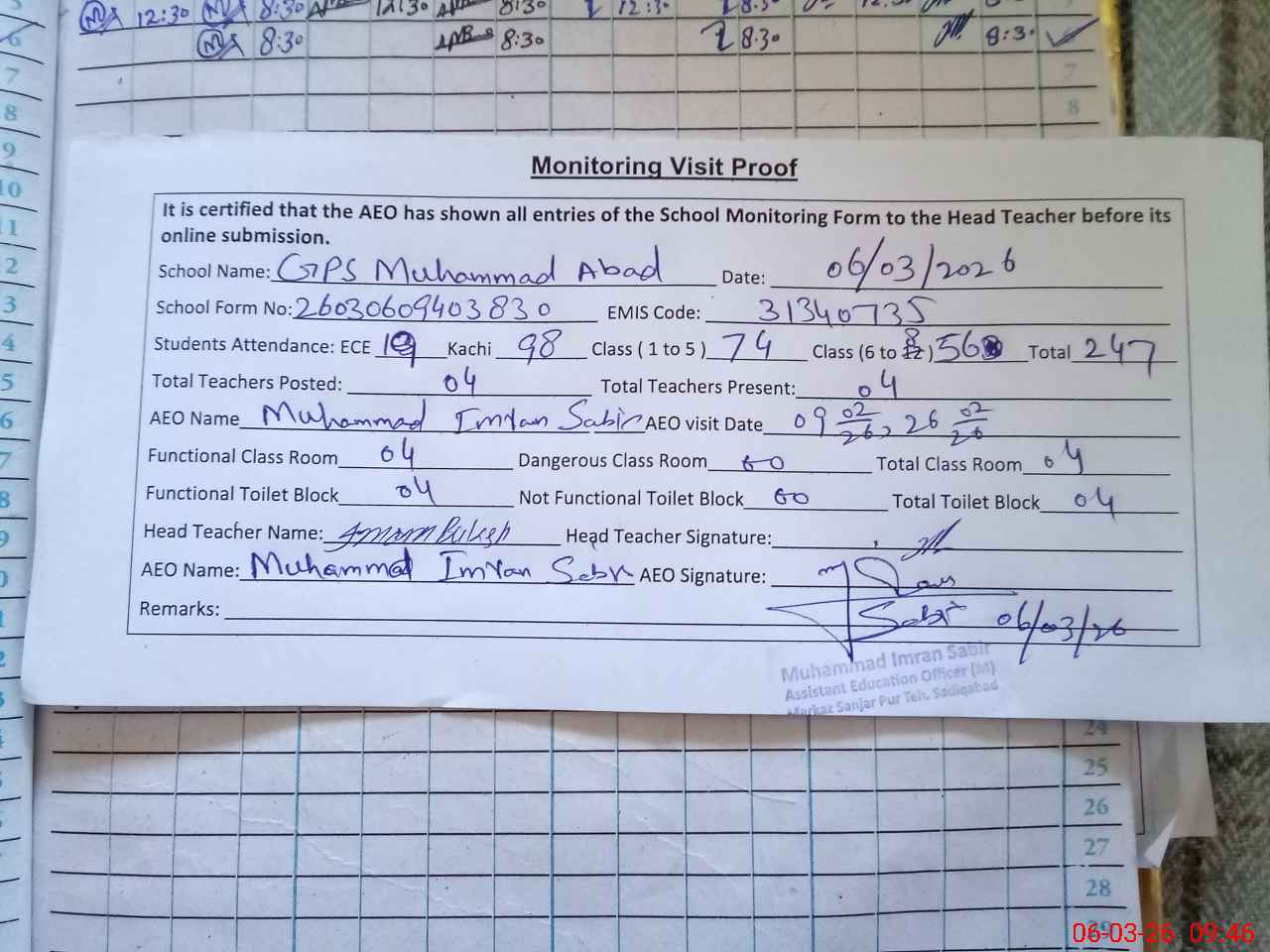 | Monitoring Date: 06-03-2026 | Start Time: 06-03-2026 09:22 AM | End Time: 06-03-2026 09:46 AM | Name of MEA: Mu**** Im**** Sa**** | |