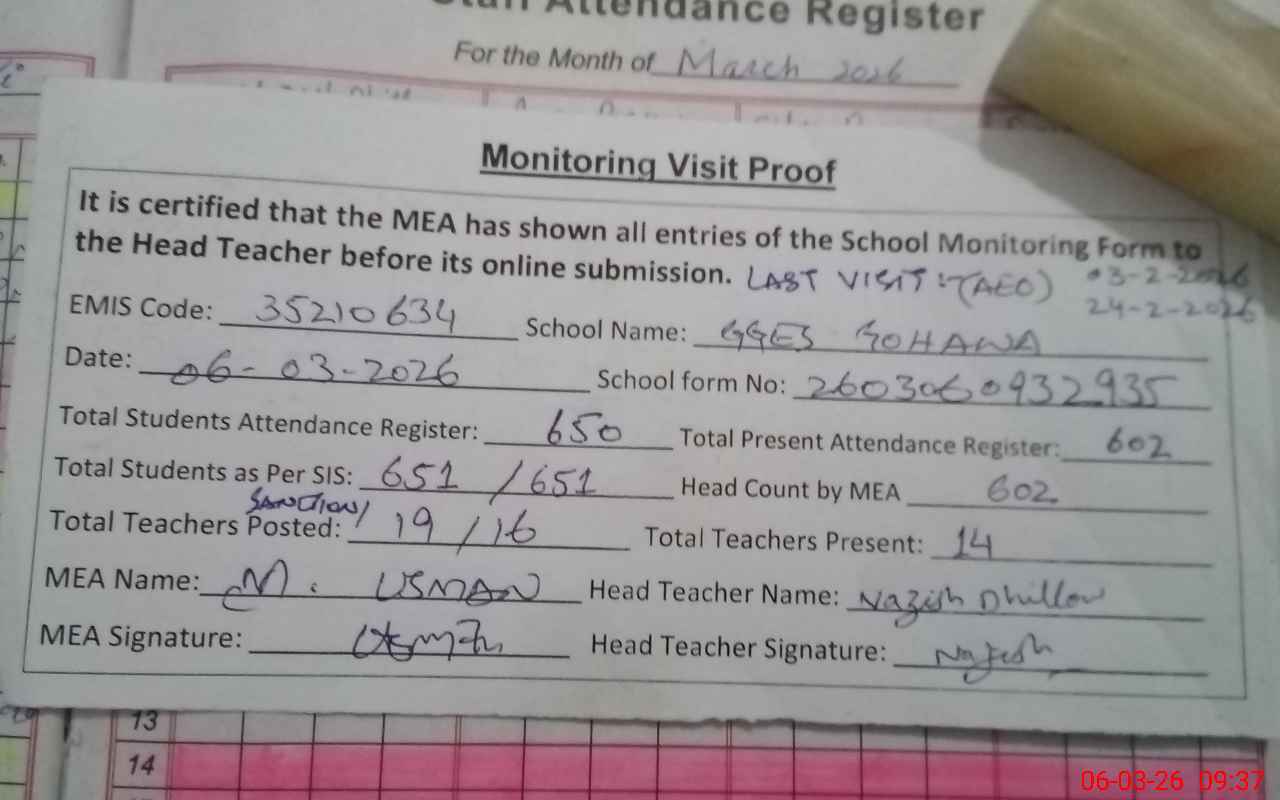 | Remarks (Use Separate Page if Required): 01 teacher named Muneeba Mehmood PST is long absent since 01 September, 2025. 01 teacher named Gohar Shaheen Marked absent due to her temporary duty letter was not available. Actually her fake attendance is marking in the said school. Head of the school is on training and according to the statement of in charge Head is that teacher named Gohar Shaheen goes to GGHS SABZAZAR by the order of DDEO from January,2026. 01 teacher named Beenish Sattar PST was 37 minutes late. 01 nonteaching staff named Faisal Asghar class IV was also absent. | |||||