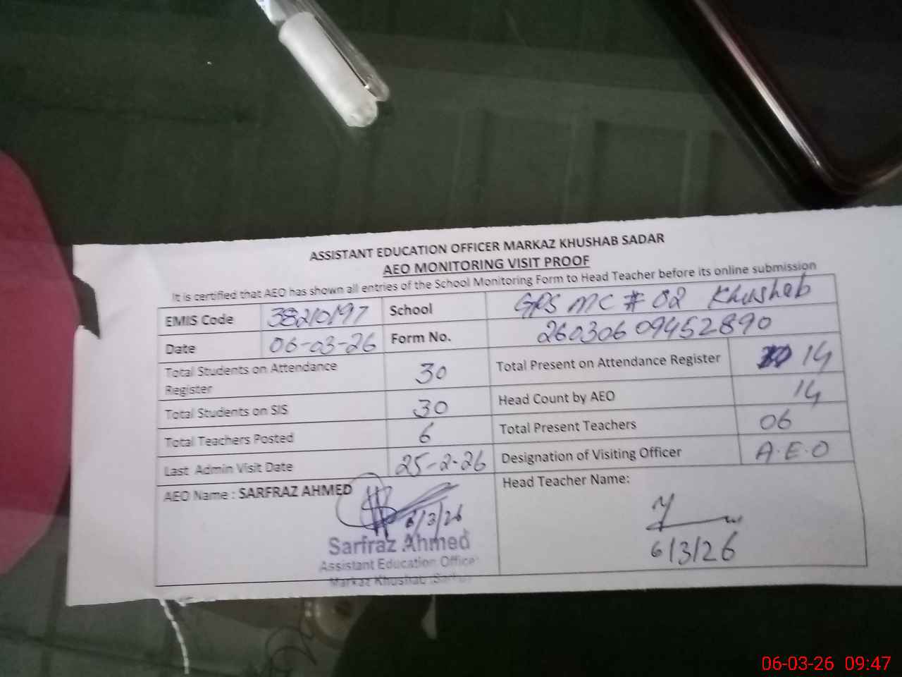 | Attendance Register | Head Teacher | MEA with School | Visit Proof |