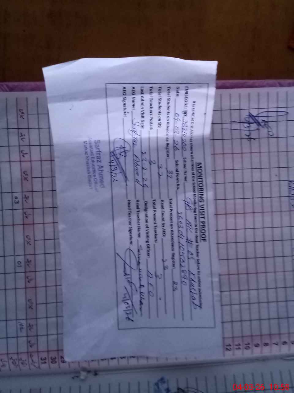 | Attendance Register | Head Teacher | MEA with School | Visit Proof |