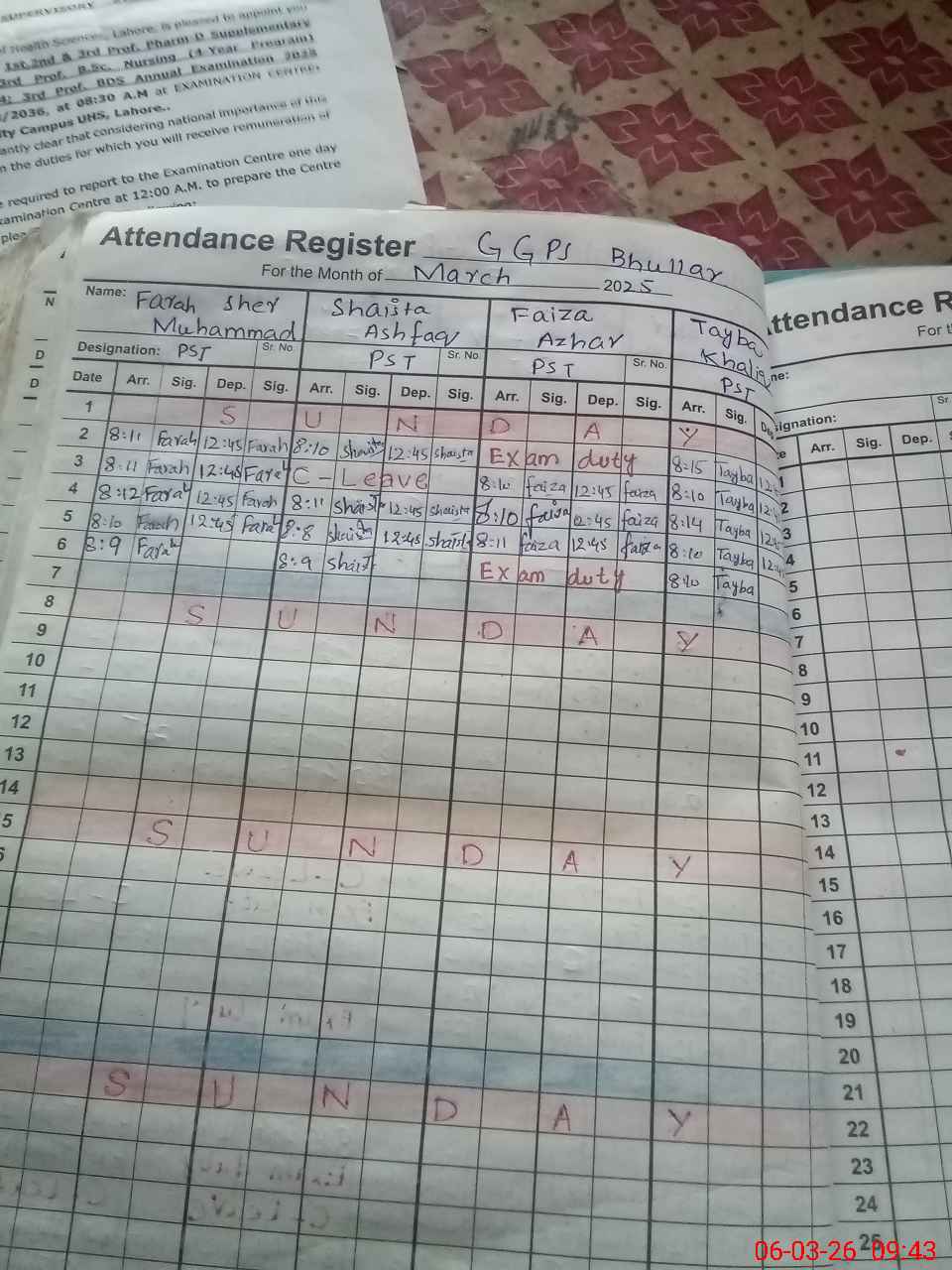 | 37**** | Fa**** Az**** | PST Science/Maths | Regular | 0 | 0 | 0 | 0 | 0 | 0 | 0 | 0 | 0 | Exam Duty |
