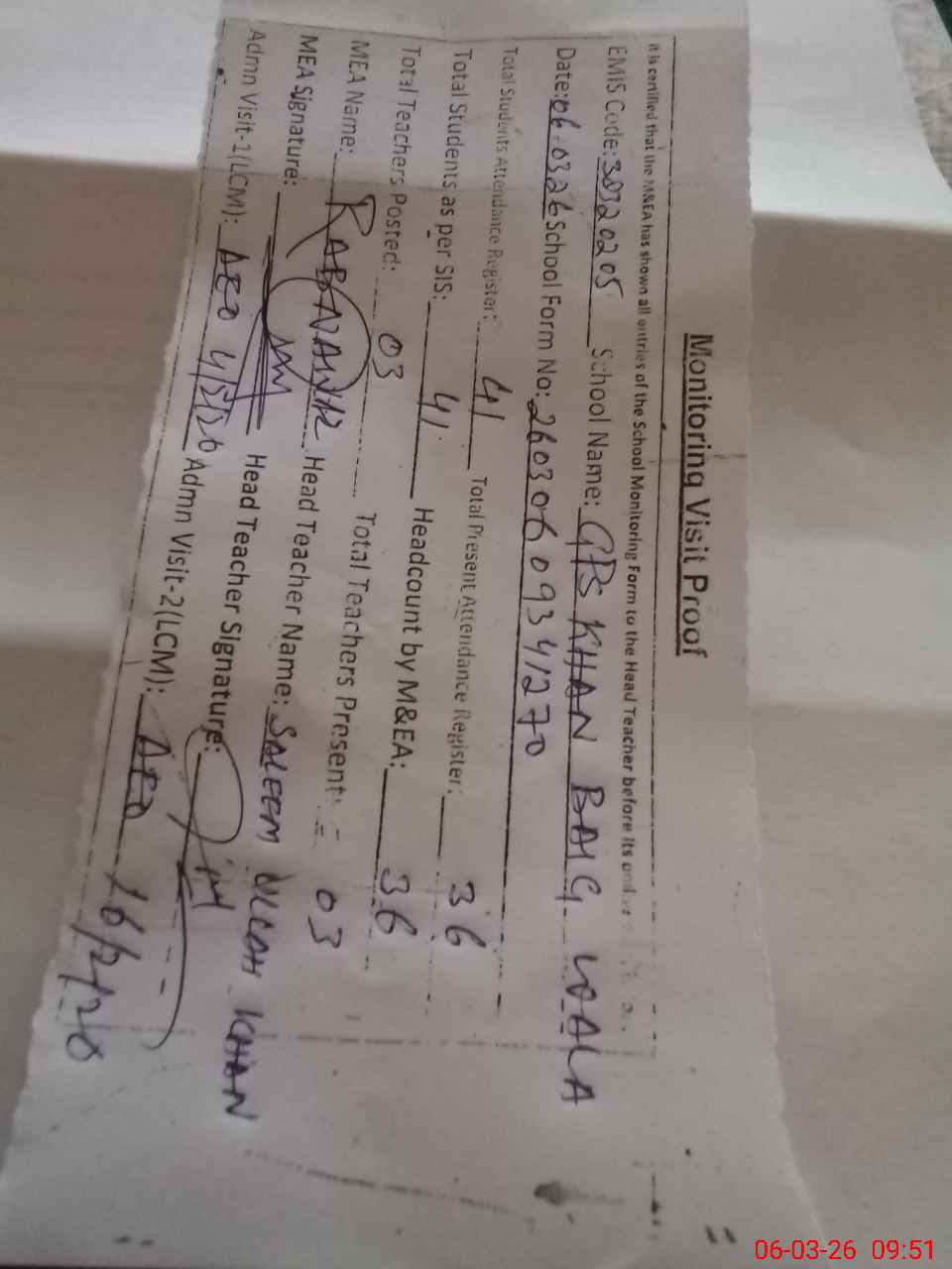 | EMIS Code: 38320205 | Name of School: GPS KHAN BAIG WALA | |||
