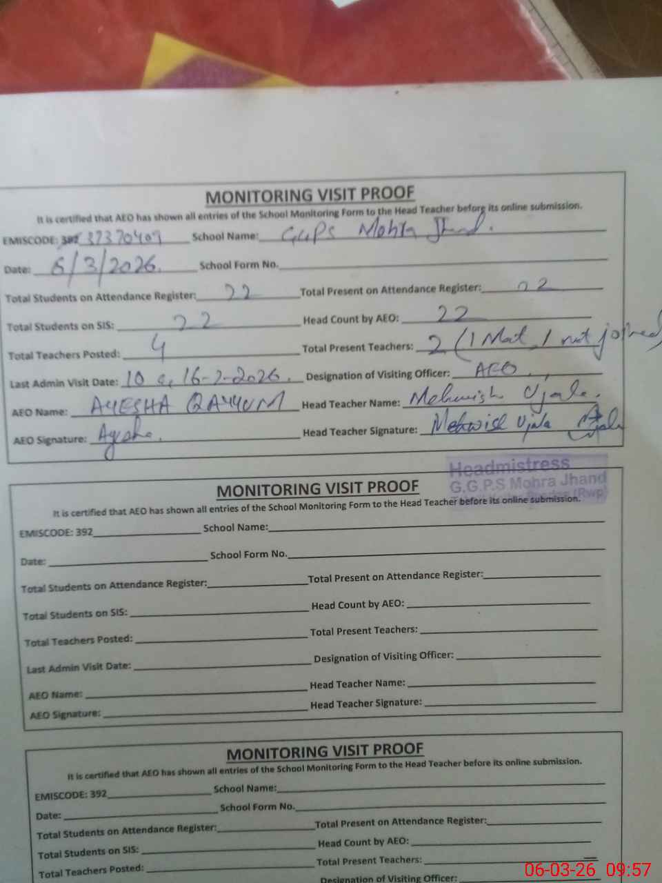 | Attendance Register | Head Teacher | MEA with School | Visit Proof |