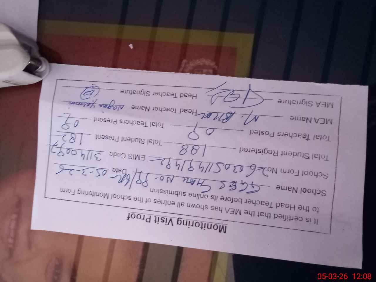 | Attendance Register | Head Teacher | MEA with School | Visit Proof |