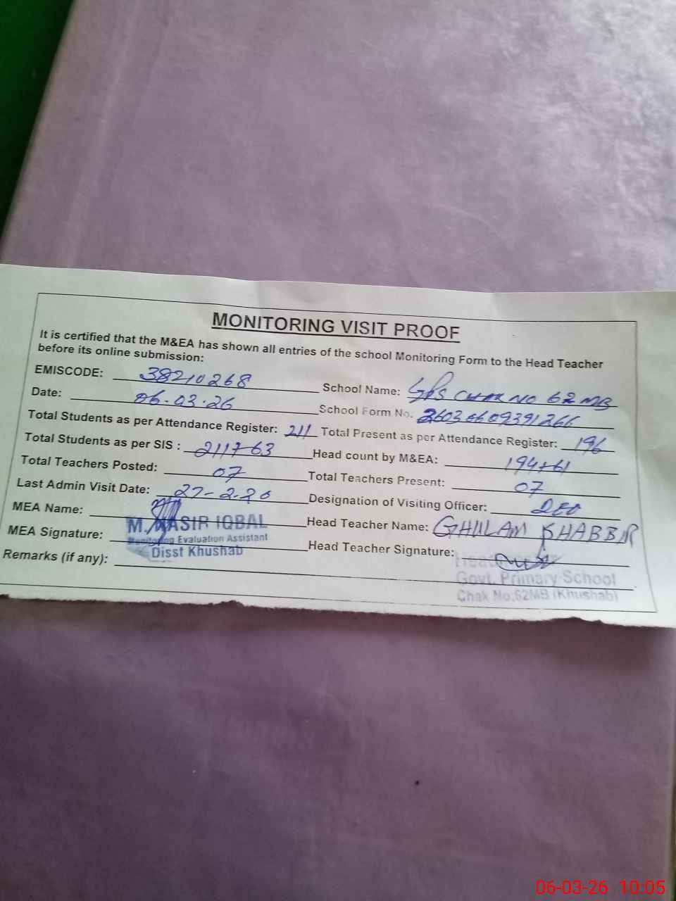| EMIS Code: 38210268 | Name of School: GPS CHAK NO 62 MB | |||