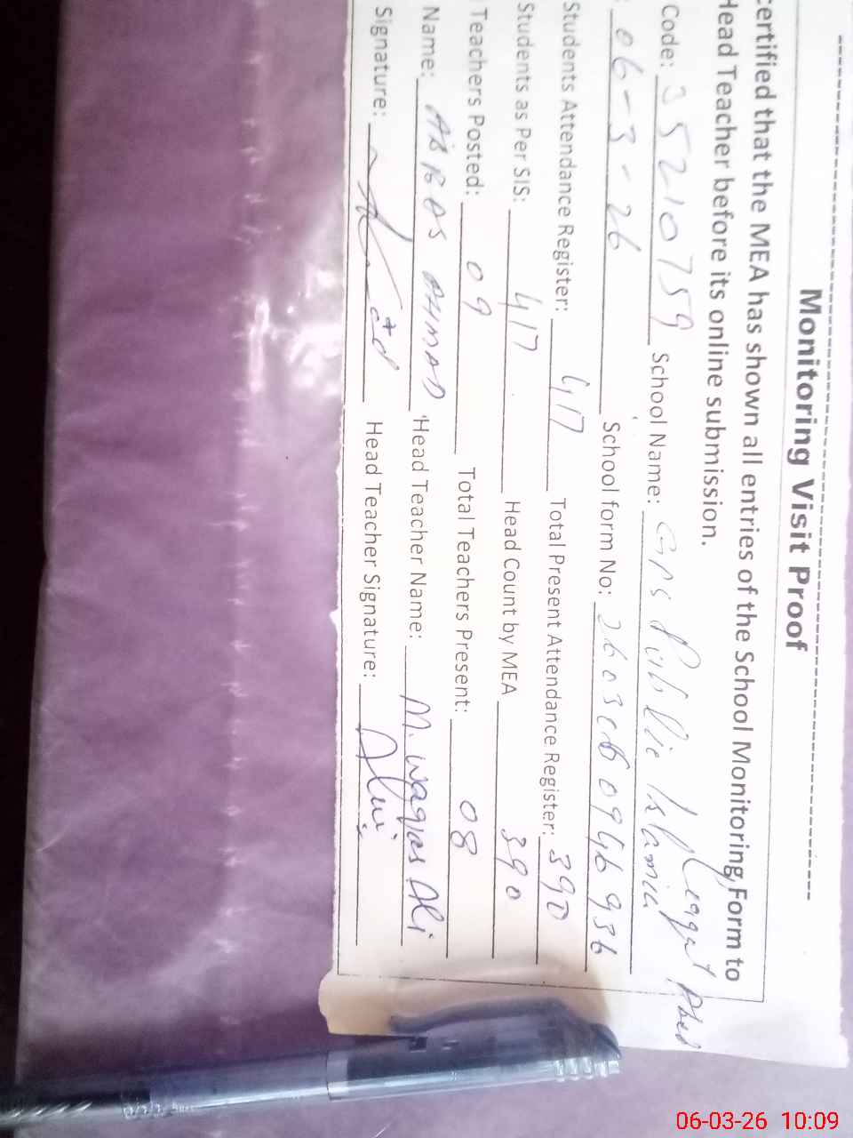 | Attendance Register | Head Teacher | MEA with School | Visit Proof |