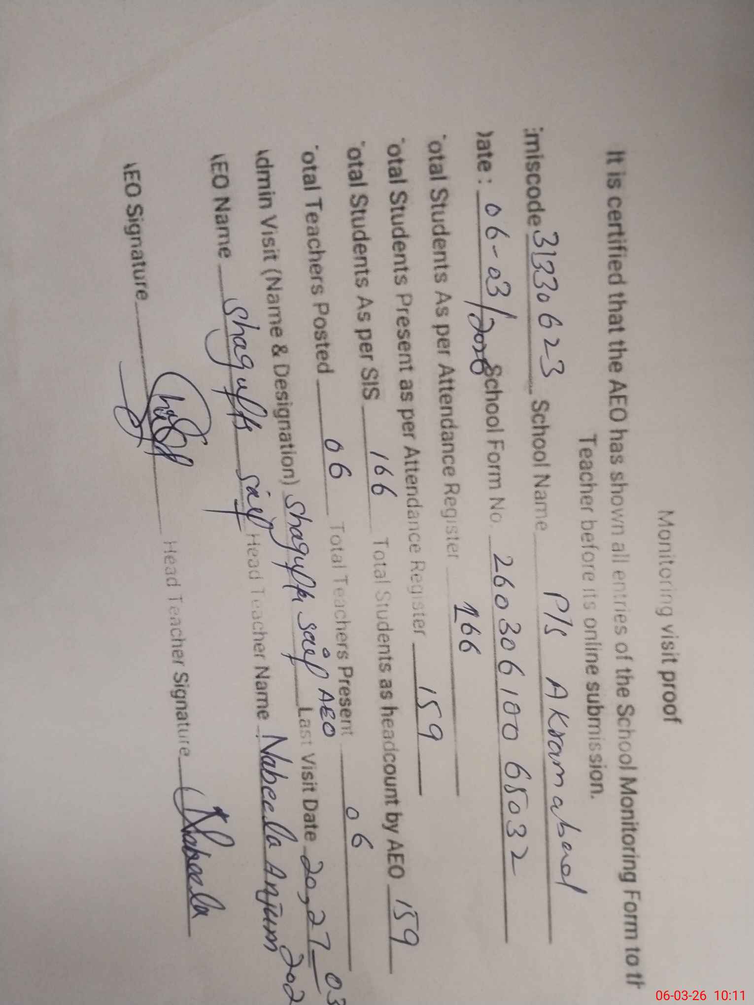 | Certified that this School was Inspected by the Undersigned MEA/DMO Today and the Information Stated Above is as Per Record. | |||||