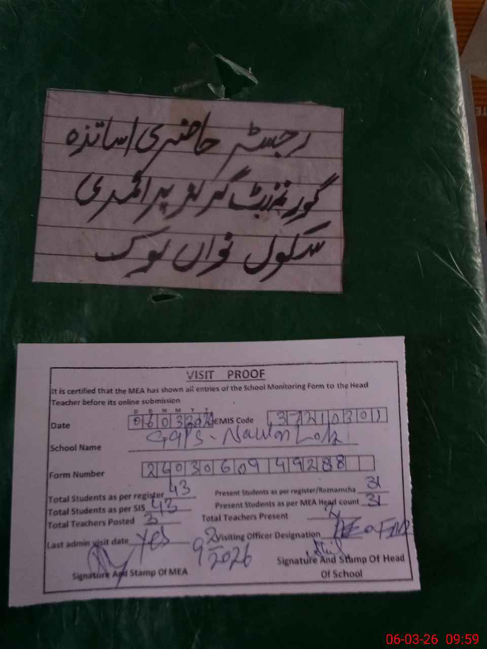 | Attendance Register | Head Teacher | MEA with School | Visit Proof |