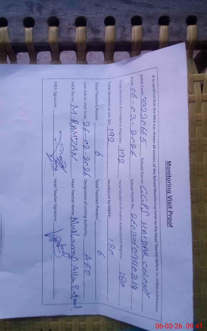 | EMIS Code: 33220665 | Name of School: GGPS HAIDAR COLONY | |||