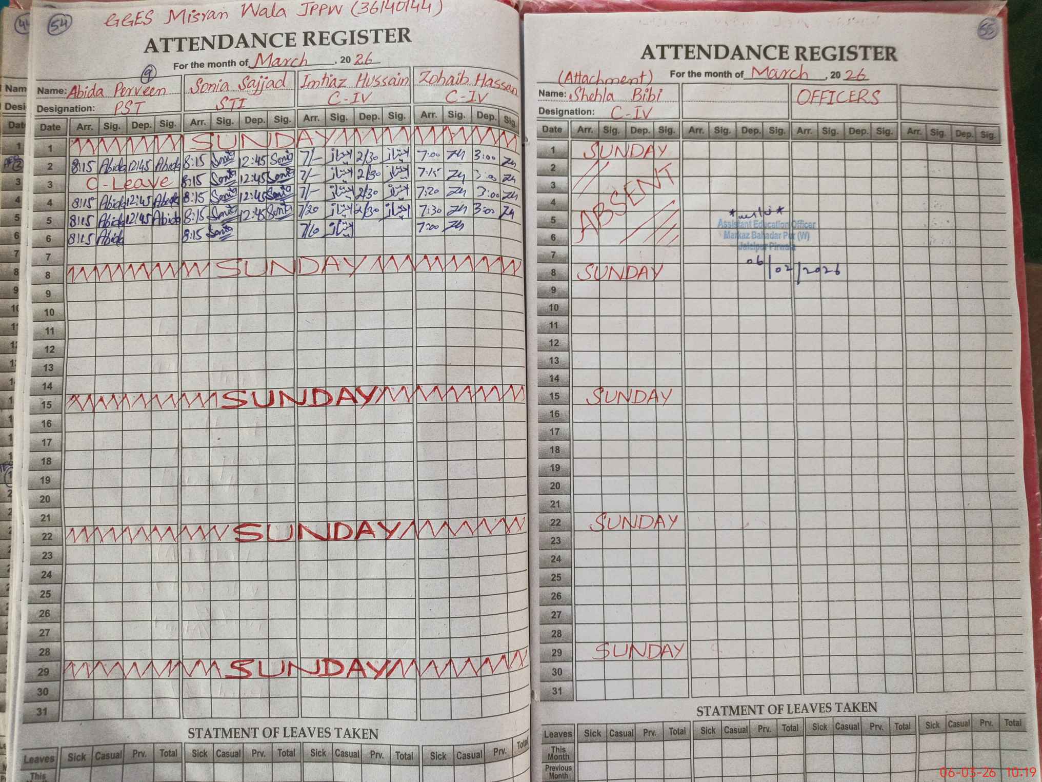 | CNIC | Full Name | Designation | R/C | Absence During Last Calender Month |
