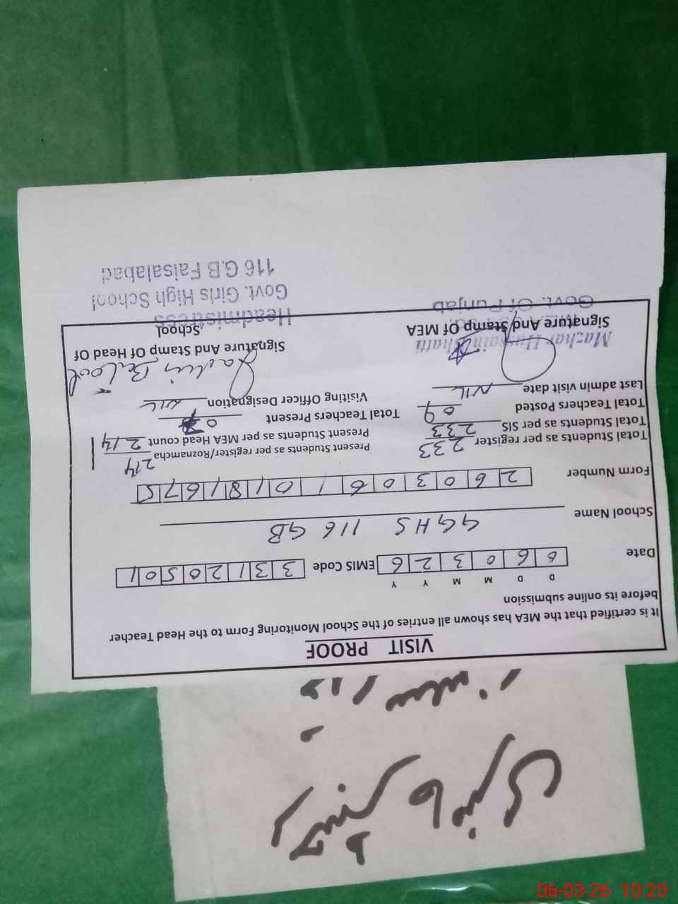 | EMIS Code: 33120501 | Name of School: GGHS CHAK 116 GB SATIANA | |||