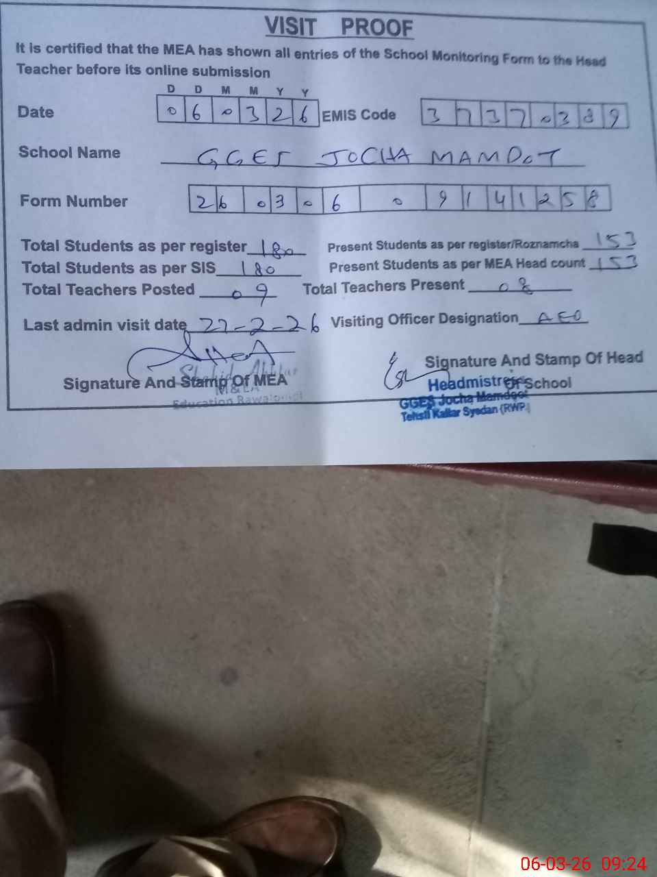 | Attendance Register | Head Teacher | MEA with School | Visit Proof |