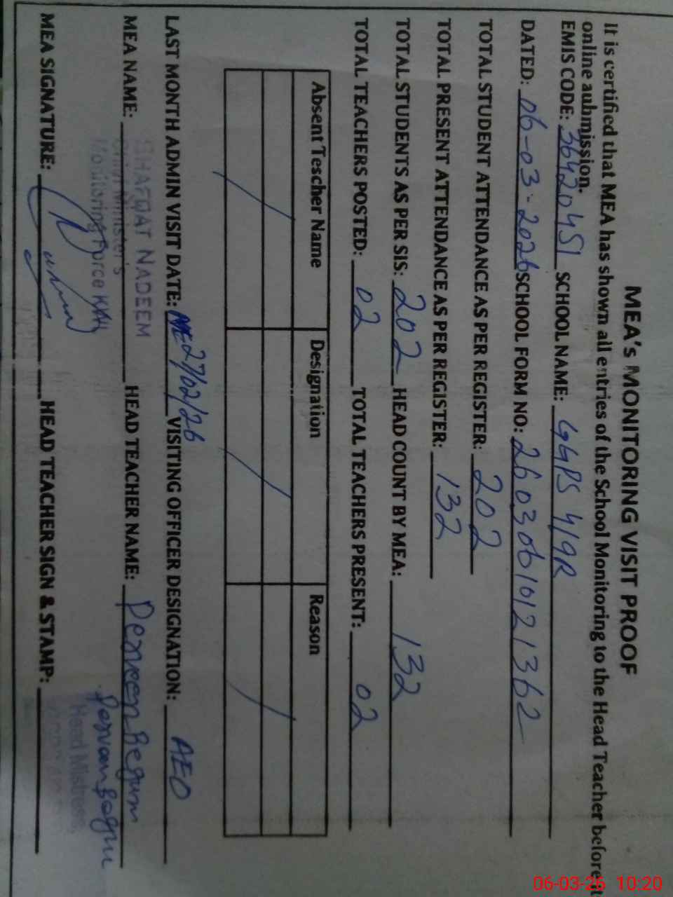 | Attendance Register | Head Teacher | MEA with School | Visit Proof |