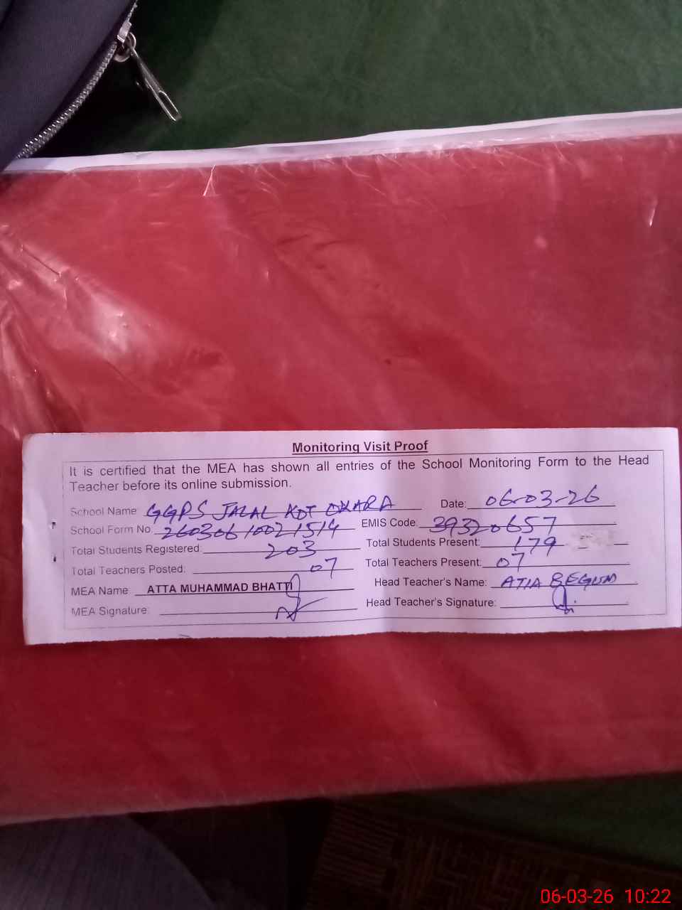 | Attendance Register | Head Teacher | MEA with School | Visit Proof |