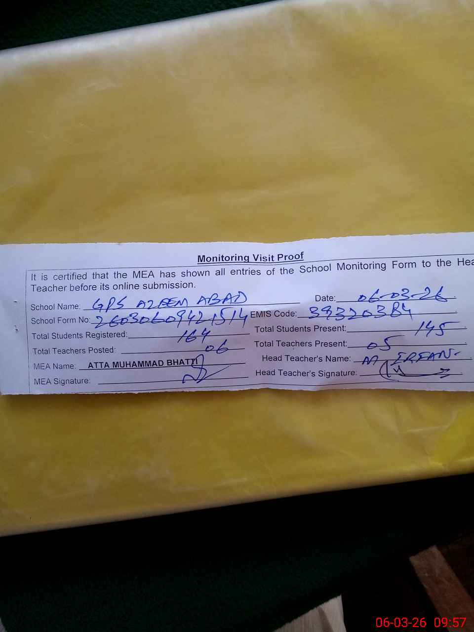 | EMIS Code: 39320384 | Name of School: GPS AZEEM ABAD , OKARA | |||