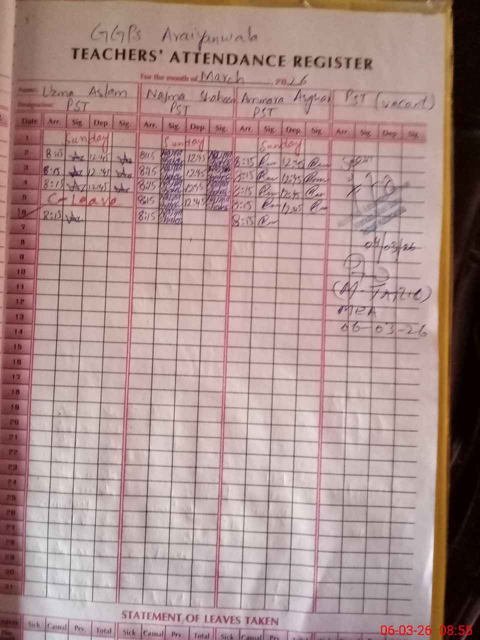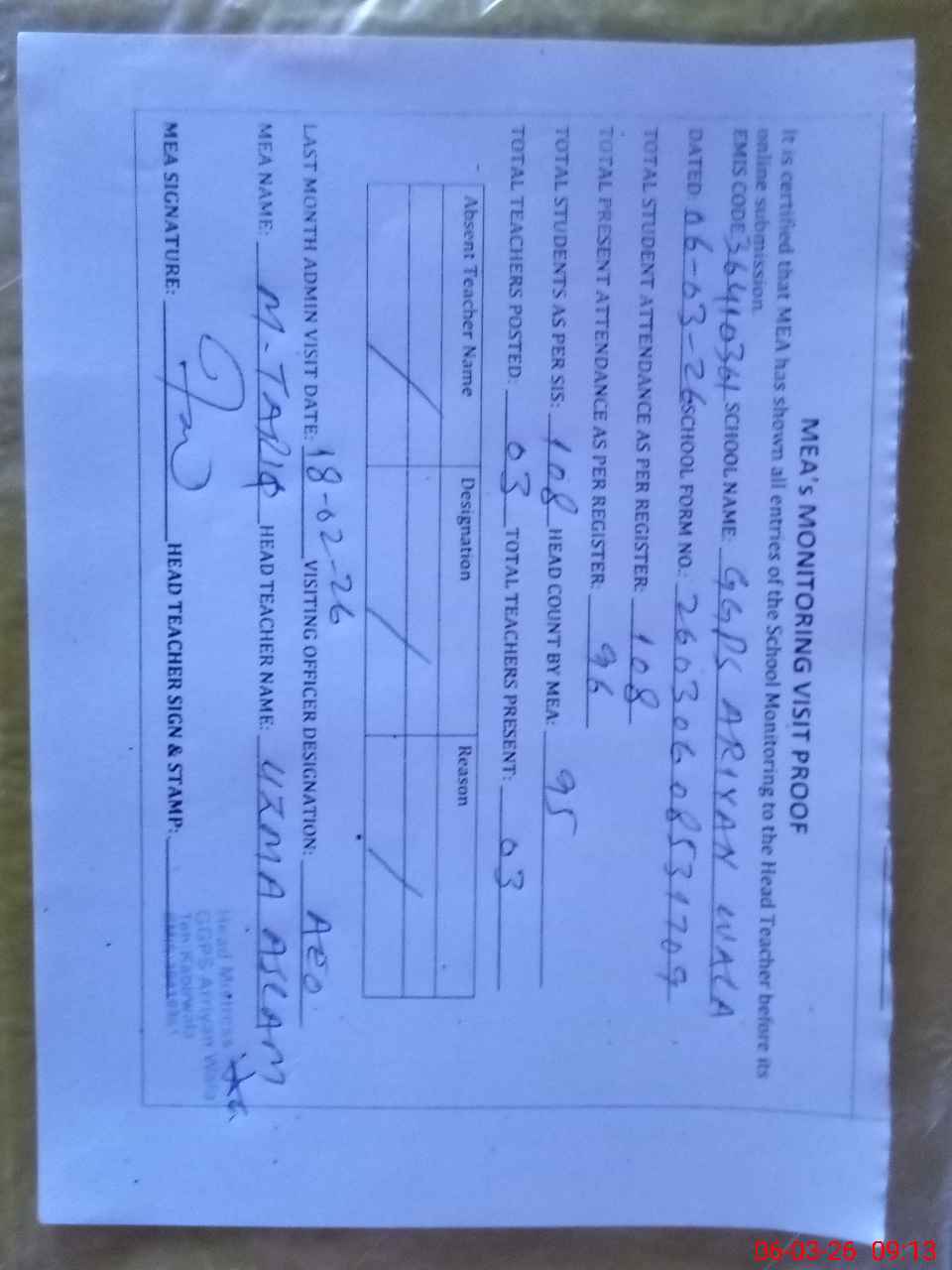 | Attendance Register | Head Teacher | MEA with School | Visit Proof |