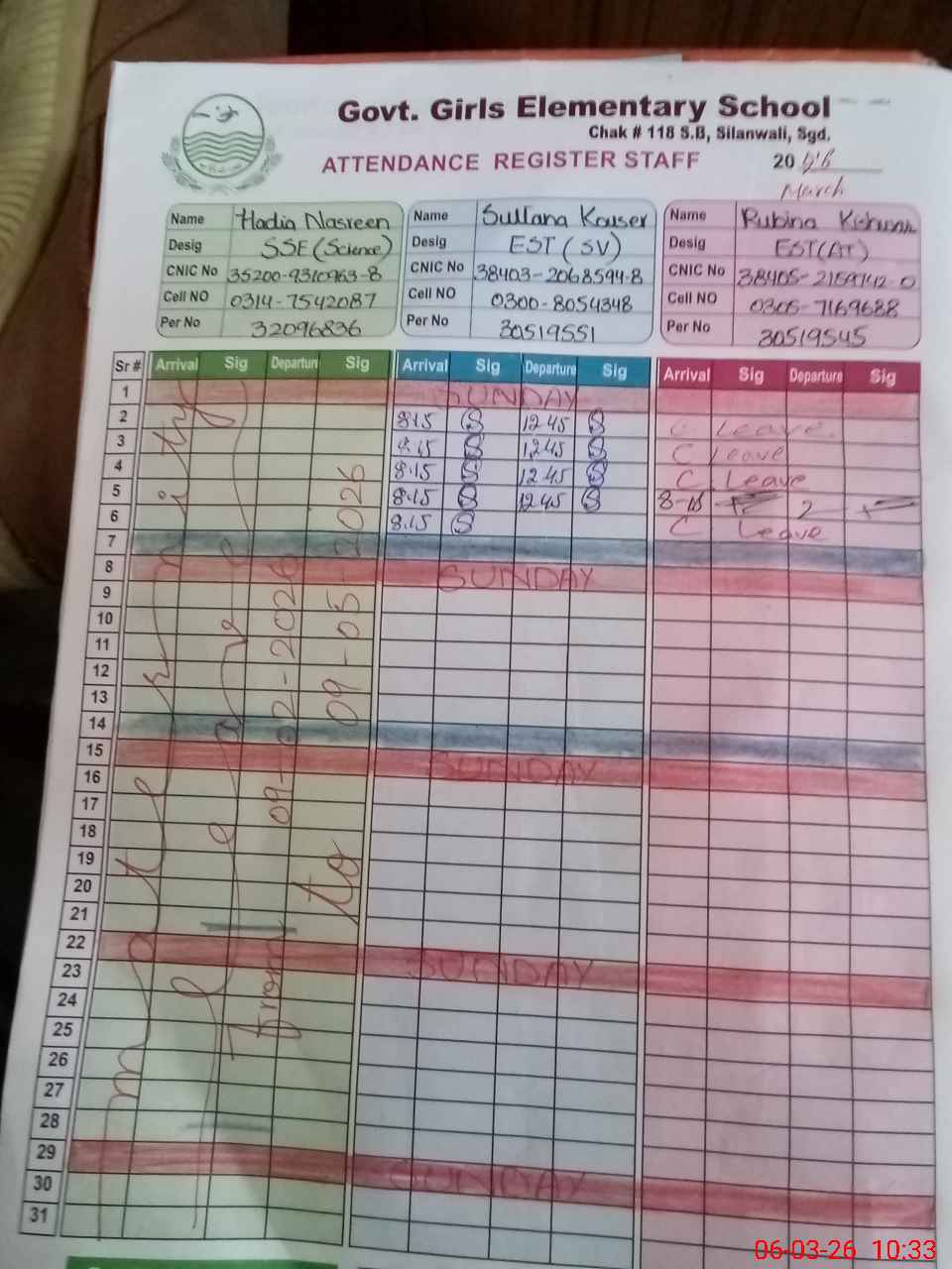 | CNIC | Full Name | Designation | R/C | Absence During Last Calender Month |