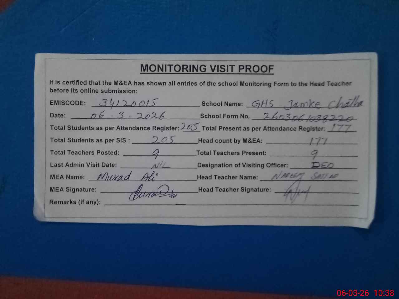 | Certified that this School was Inspected by the Undersigned MEA/DMO Today and the Information Stated Above is as Per Record. | |||||