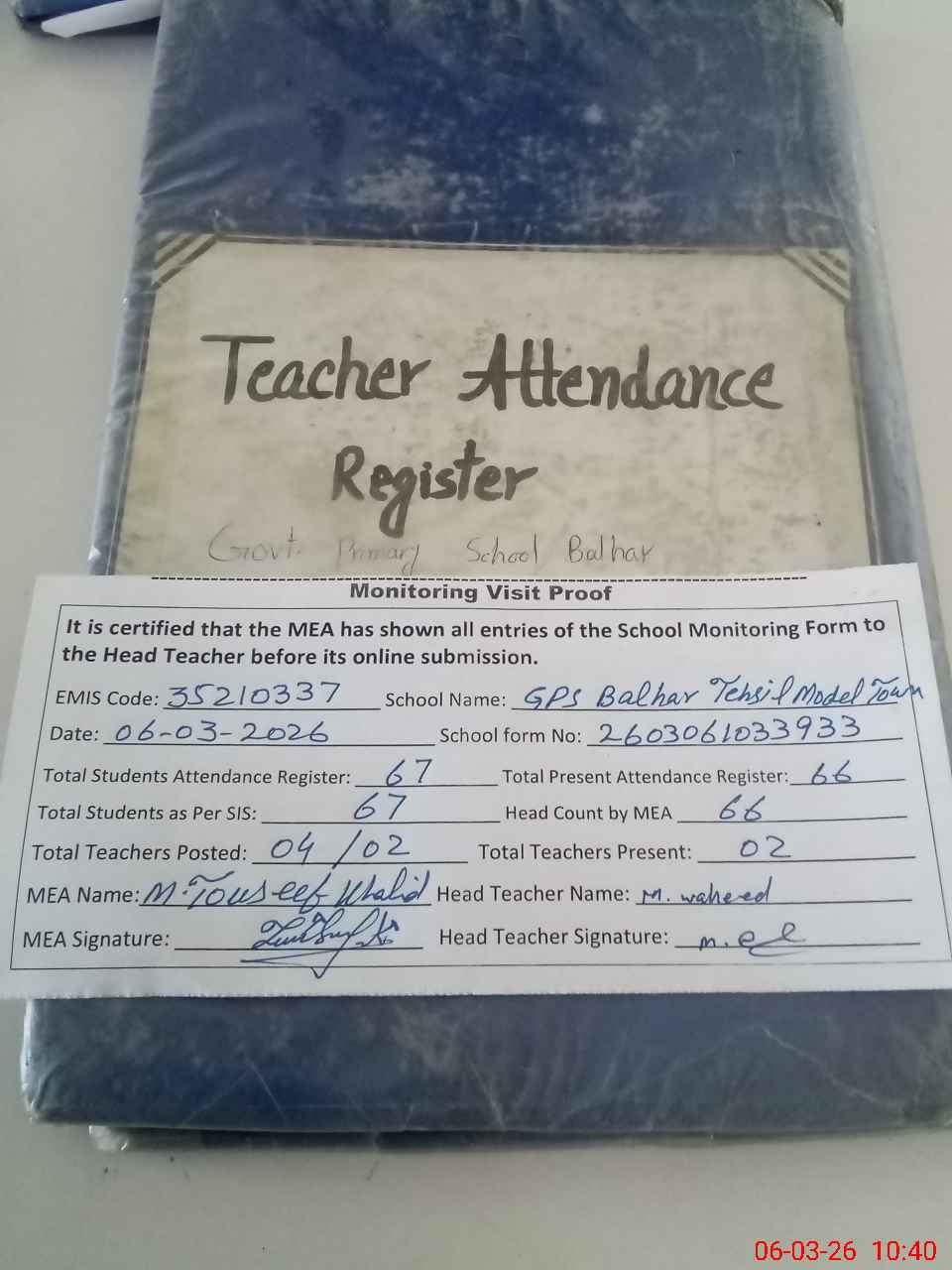| Attendance Register | Head Teacher | MEA with School | Visit Proof |