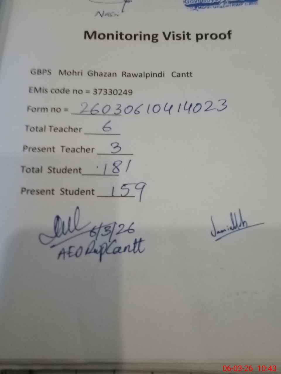 | Certified that this School was Inspected by the Undersigned MEA/DMO Today and the Information Stated Above is as Per Record. | |||||