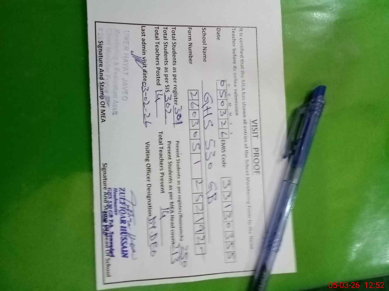 | Certified that this School was Inspected by the Undersigned MEA/DMO Today and the Information Stated Above is as Per Record. | |||||