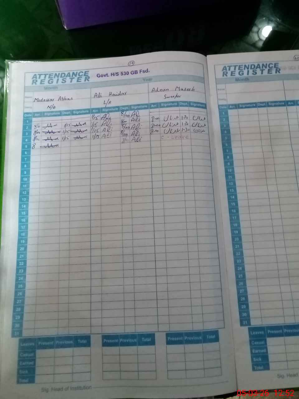 | CNIC | Full Name | Designation | R/C | Absence During Last Calender Month |