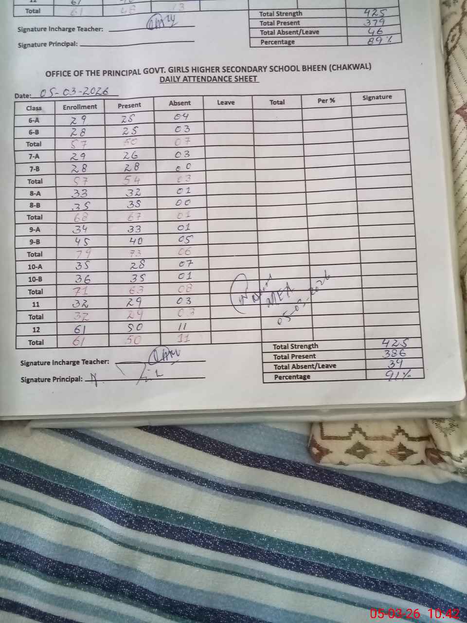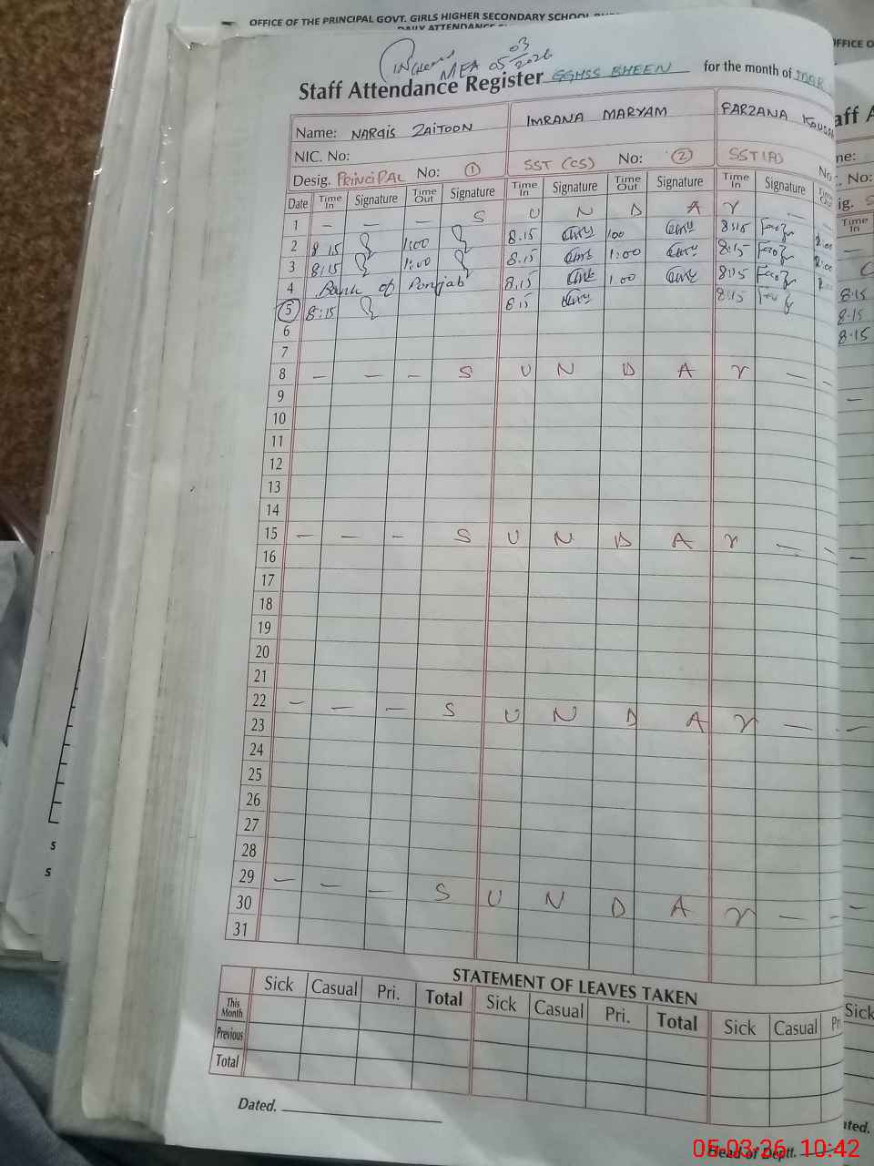 | Remarks (Use Separate Page if Required): SST Naseem begum was marked on leave but no approved online record was available in school so I marked her unauthorized one washing point having no water was available | |||||