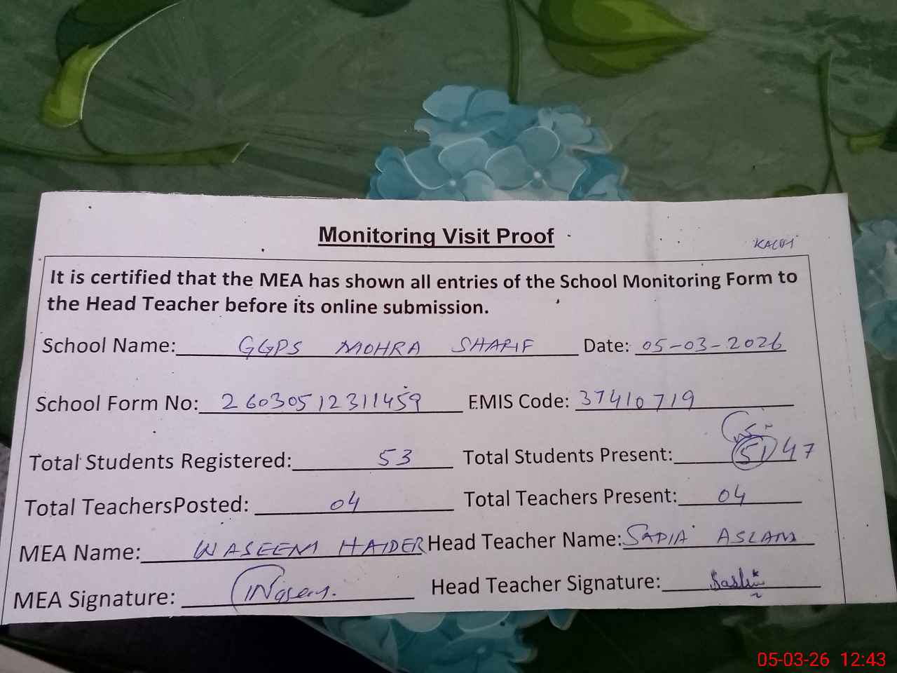 | EMIS Code: 37410719 | Name of School: GGPS MOHRA SHARIF | |||