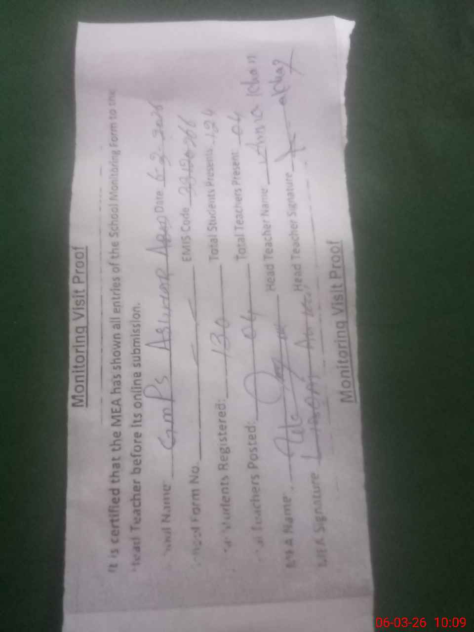 | Attendance Register | Head Teacher | MEA with School | Visit Proof |