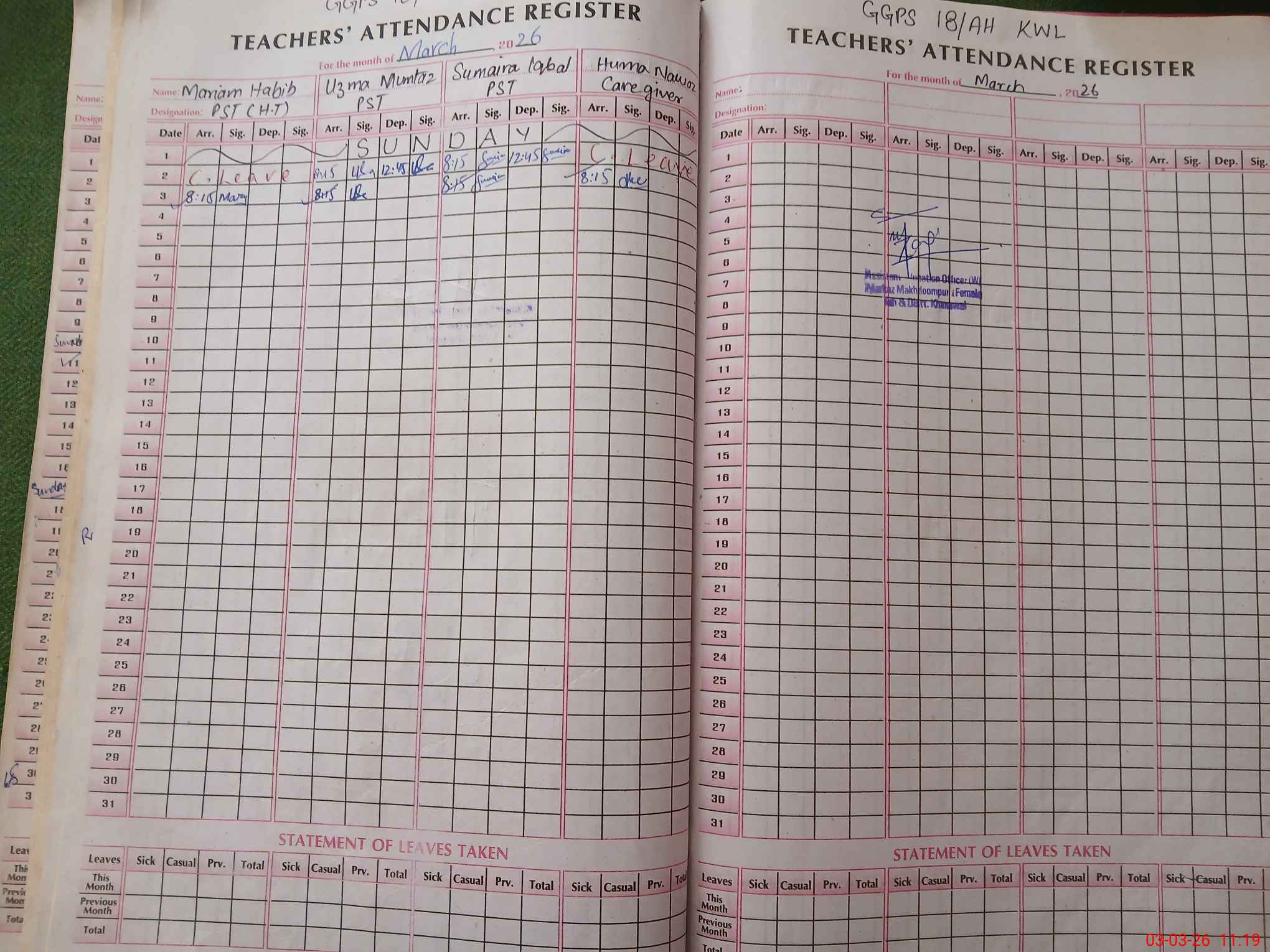 | Name: Ma**** Ha**** Designation: (School Headmaster's/Headmistress's) PST Phone/Cell Number: 03**** |
