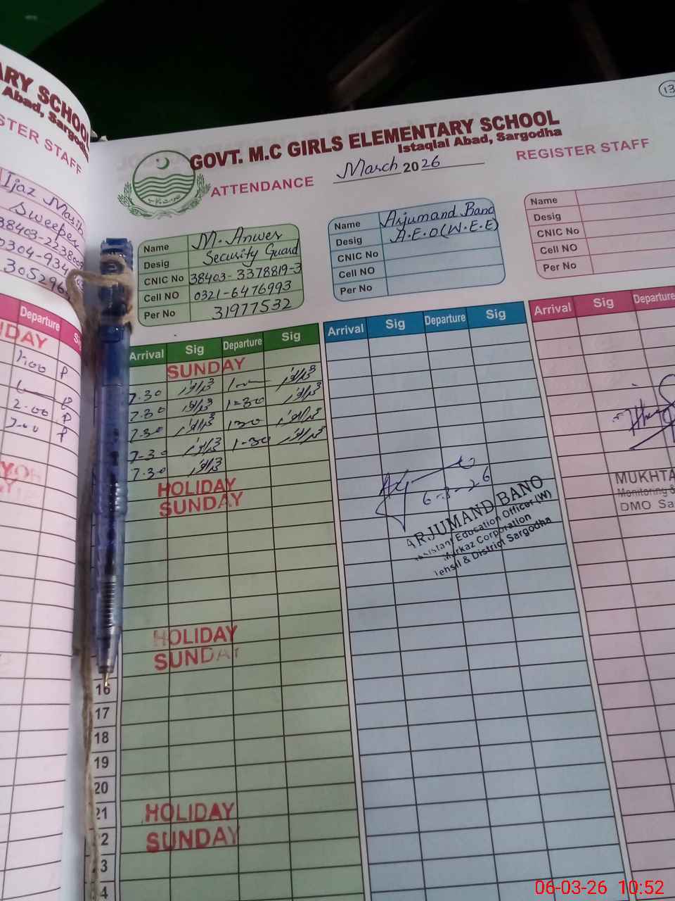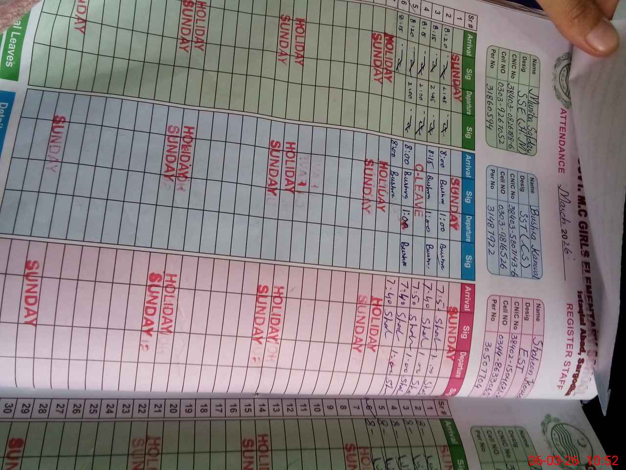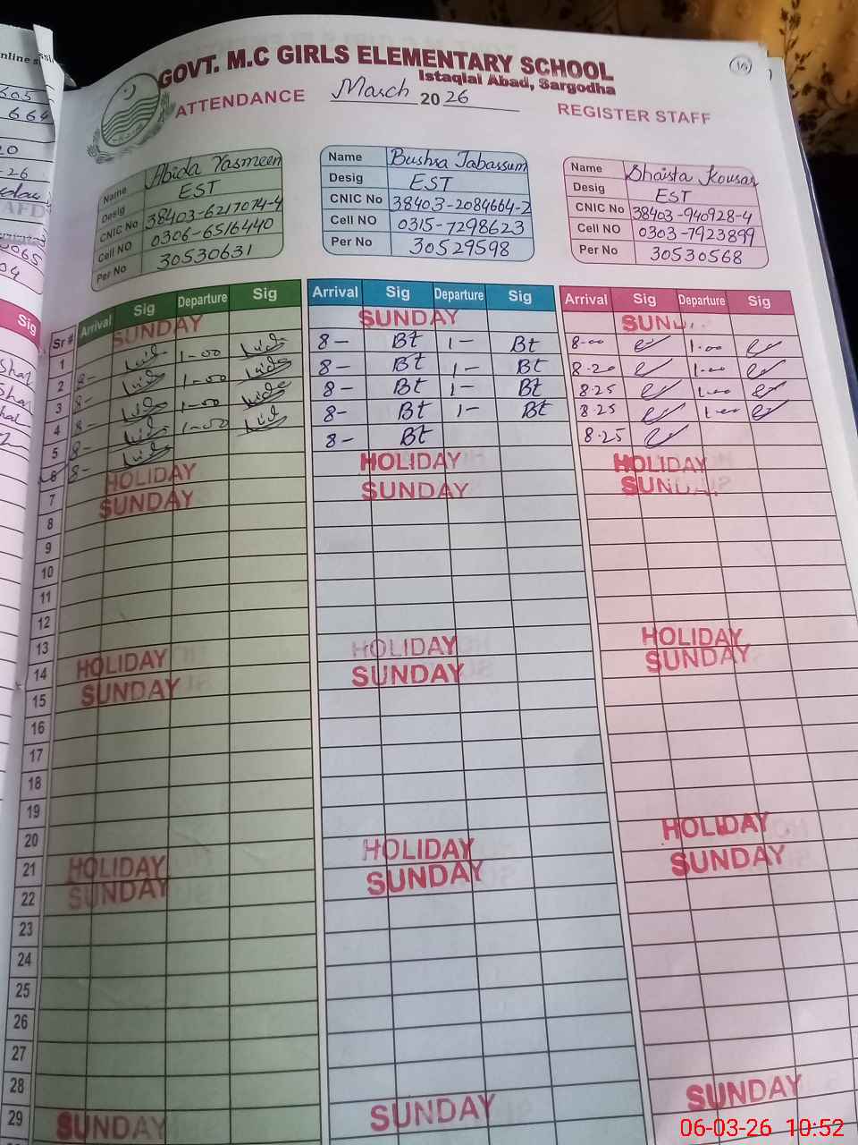 | CNIC | Full Name | Designation | R/C | Absence During Last Calender Month |