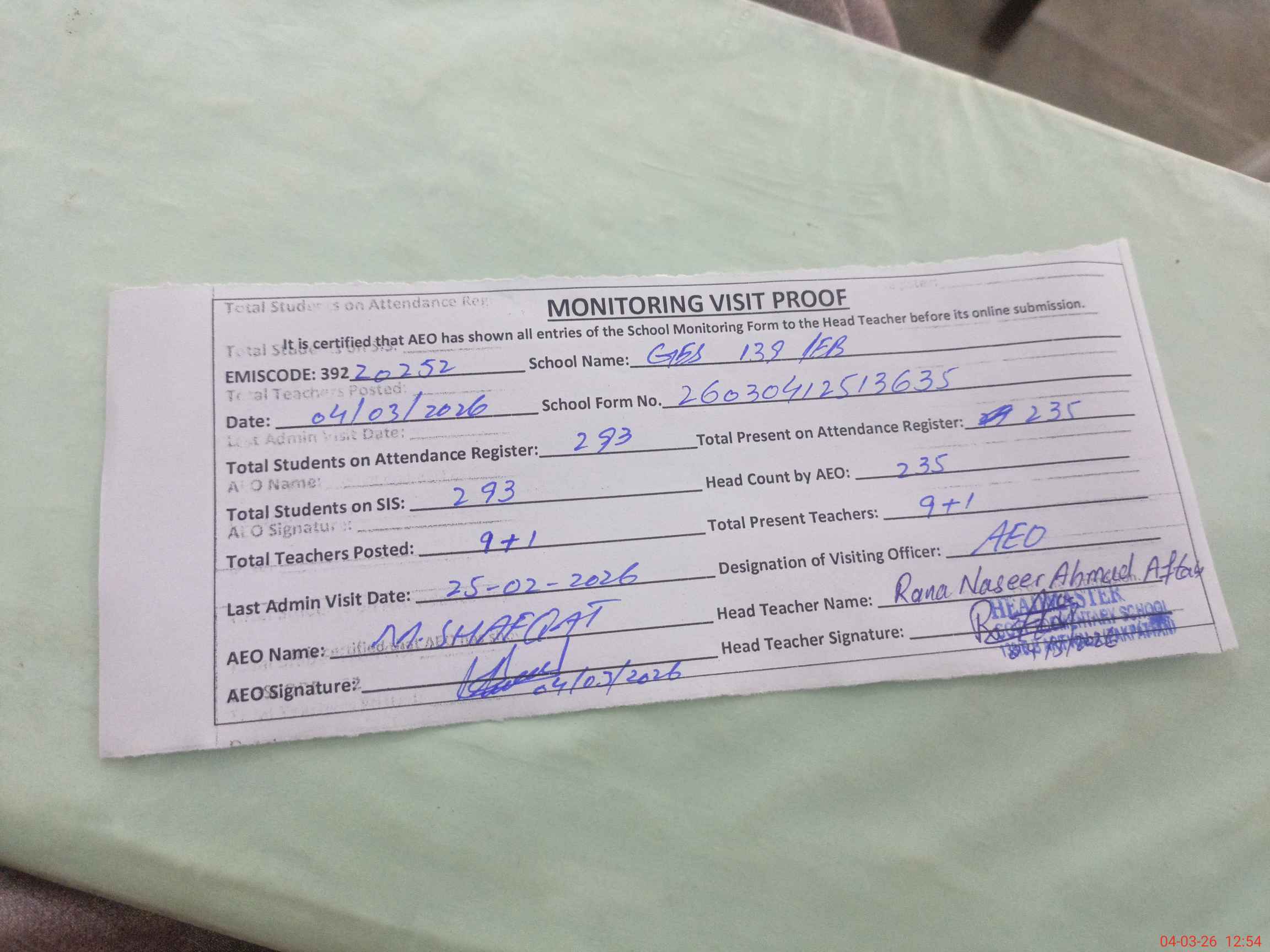 | Attendance Register | Head Teacher | MEA with School | Visit Proof |