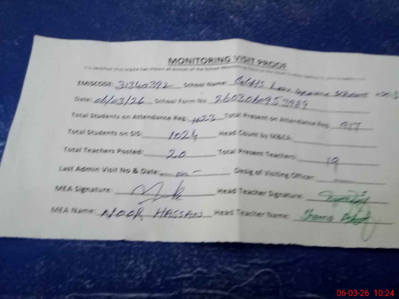 | Attendance Register | Head Teacher | MEA with School | Visit Proof |