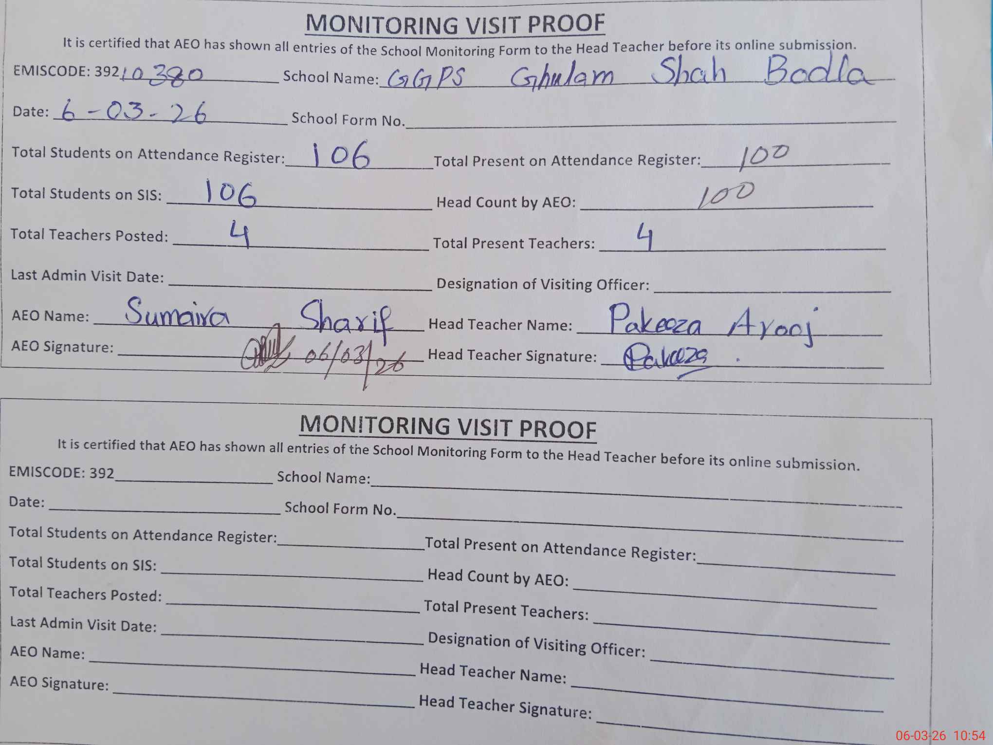 | Attendance Register | Head Teacher | MEA with School | Visit Proof |