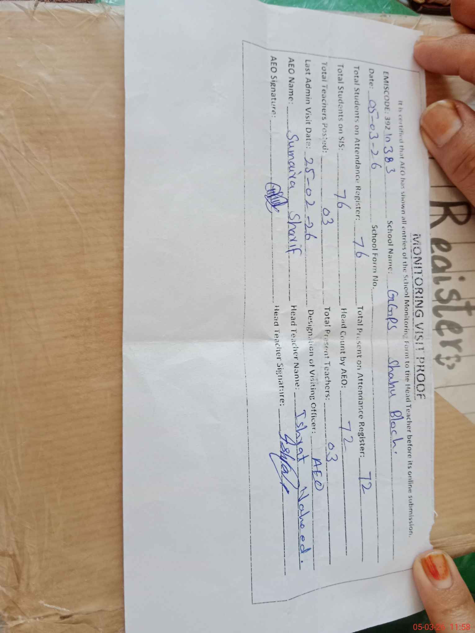 | Attendance Register | Head Teacher | MEA with School | Visit Proof |