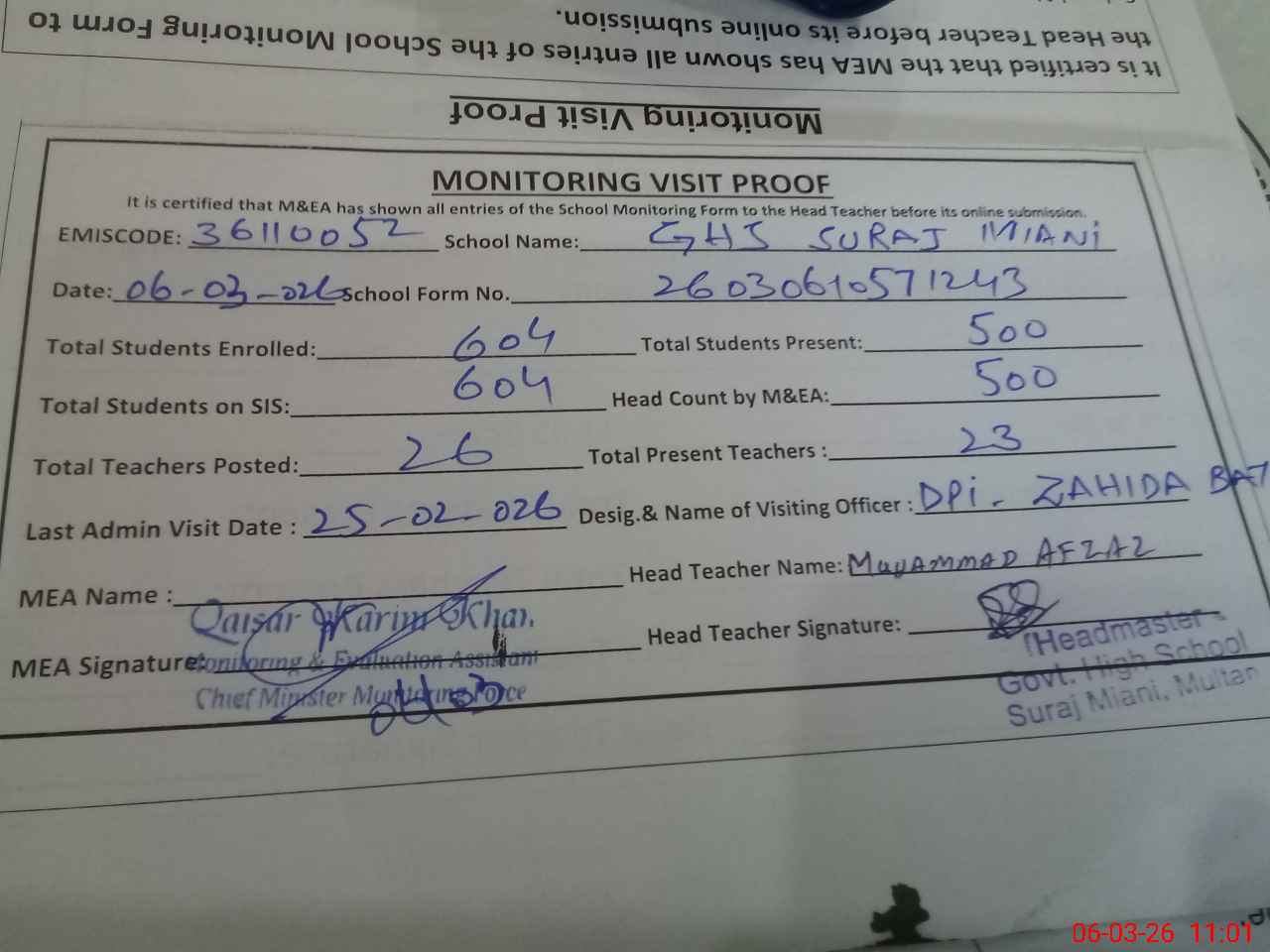 | Attendance Register | Head Teacher | MEA with School | Visit Proof |